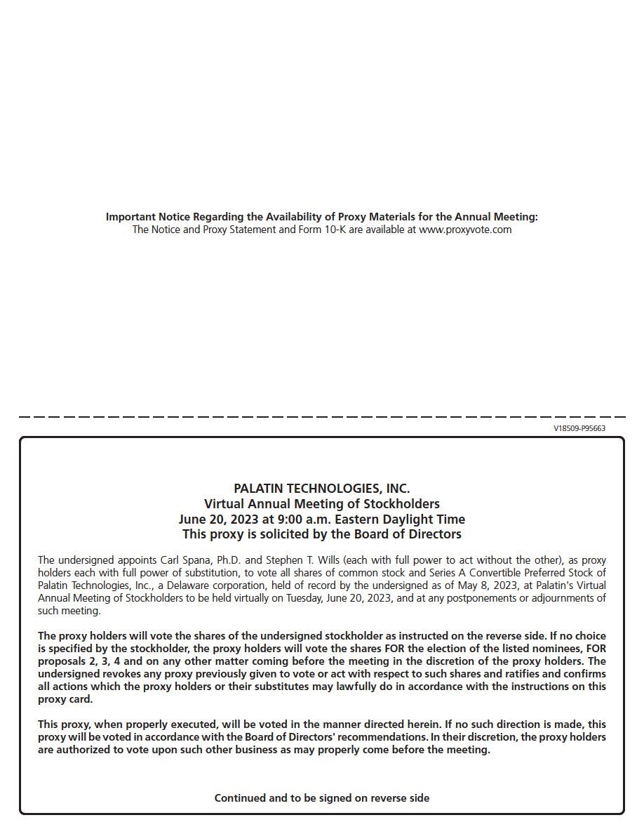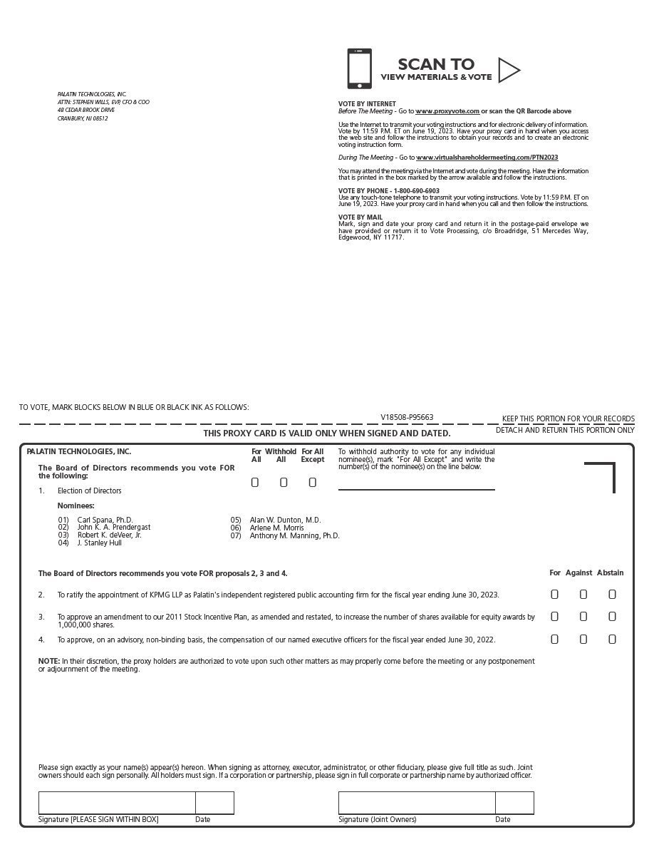 You are welcome to attend Palatin’s Annual Meeting of Stockholders, which will be held virtually via live audio webcast on Tuesday, June 20, 2023, at 9:00 a.m., Eastern Daylight Time. Details regarding the virtual meeting, including how you can access and participate in the meeting, are described in the accompanying Notice and Proxy Statement.
