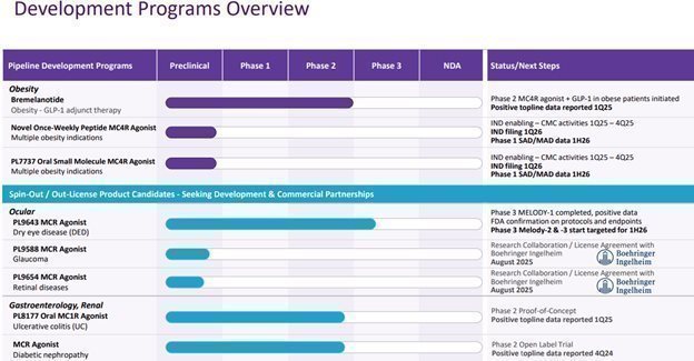| PL8177, an oral peptide formulation for treatment of ulcerative colitis, which entered Phase 2 clinical trials in the third quarter of calendar year 2022 and announced topline results in March 2025, with one-third of patients dosed with PL8177 achieving clinical remission while the placebo group saw no clinical remission; and an MC4 agonist for diabetic nephropathy, which reported positive topline date in the fourth quarter of 2024; |