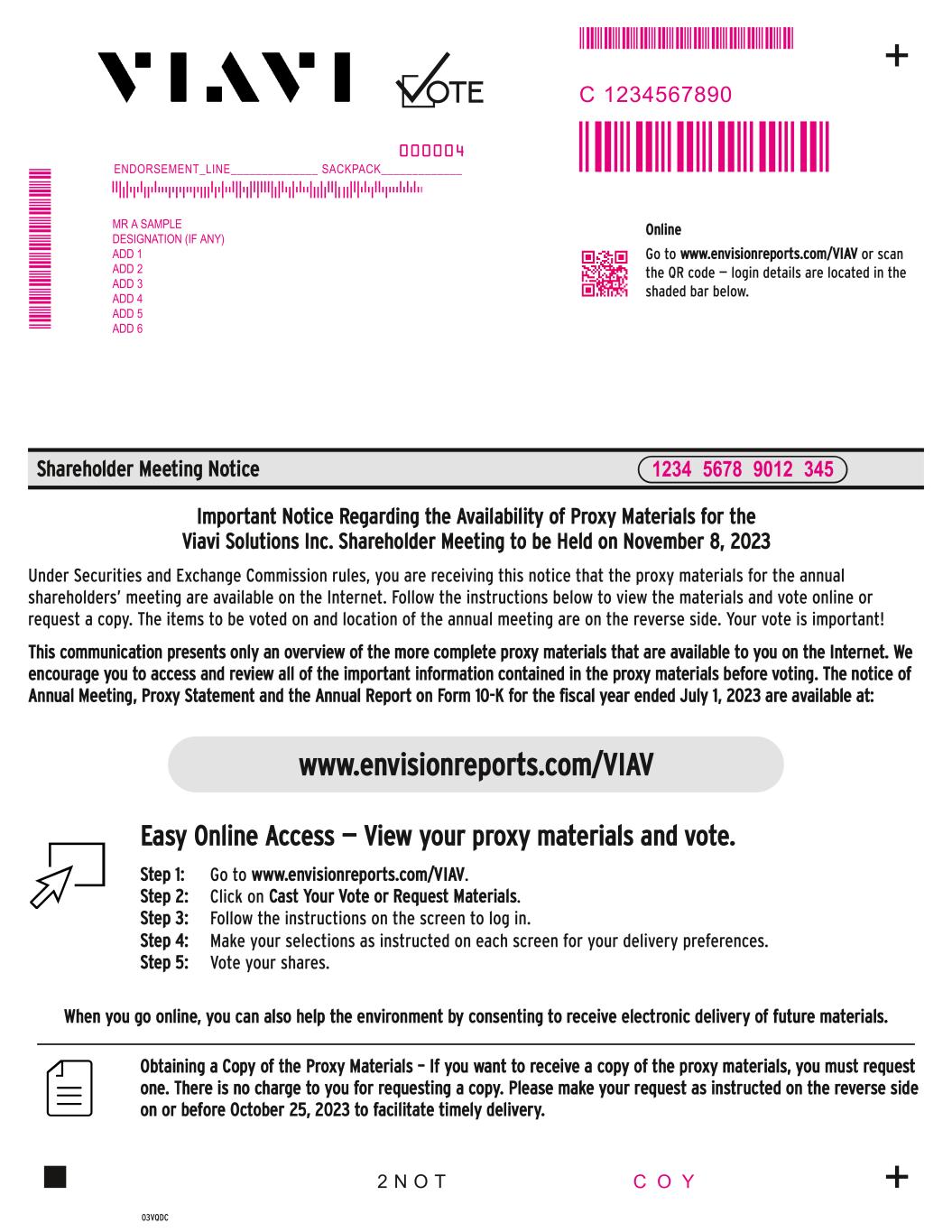 Step 1: Go to www.envisionreports.com/VIAV. Step 2: Click on Cast Your Vote or Request Materials. Step 3: Follow the instructions on the screen to log in. www.envisionreports.com/VIAV Online Go to www.envisionreports.com/VIAV or scan the QR code — login details are located in the shaded bar below. The Sample Company Shareholder Meeting Notice 03VQDC + + Important Notice Regarding the Availability of Proxy Materials for the Viavi Solutions Inc. Shareholder Meeting to be Held on November 8, 2023 Under Securities and Exchange Commission rules, you are receiving this notice that the proxy materials for the annual shareholders’ meeting are available on the Internet. Follow the instructions below to view the materials and vote online or request a copy. The items to be voted on and location of the annual meeting are on the reverse side. Your vote is important! This communication presents only an overview of the more complete proxy materials that are available to you on the Internet. We encourage you to access and review all of the important information contained in the proxy materials before voting. The notice of Annual Meeting, Proxy Statement and the Annual Report on Form 10-K for the fiscal year ended July 1, 2023 are available at: Obtaining a Copy of the Proxy Materials – If you want to receive a copy of the proxy materials, you must request one. There is no charge to you for requesting a copy. Please make your request as instructed on the reverse side on or before October 25, 2023 to facilitate timely delivery. 2 N O T Easy Online Access — View your proxy materials and vote. When you go online, you can also help the environment by consenting to receive electronic delivery of future materials. Step 4: Make your selections as instructed on each screen for your delivery preferences. Step 5: Vote your shares. MMMMMMMMMMMM M M M M M M M M M MR A SAMPLE DESIGNATION (IF ANY) ADD 1 ADD 2 ADD 3 ADD 4 ADD 5 ADD 6 ENDORSEMENT_LINE______________ SACKPACK_____________ 1234 5678 9012 345 C 1234567890 C O Y 000004 MMMMMMM