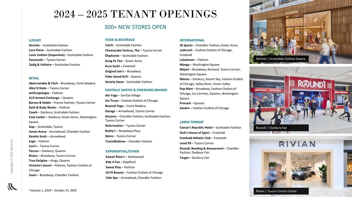 2024 – 2025 TENANT OPENINGS 300+ NEW STORES OPEN FOOD & BEVERAGE LUXURY INTERNATIONAL Hermès – Scottsdale Fashion Catch – Scottsdale Fashion JD Sports – Chandler Fashion, Green Acres Loro Piana – Scottsdale Fashion Laderach – Fashion Outlets of Chicago, Cheesecake Factory, The – Tysons Corner Louis Vuitton (Expansion) – Scottsdale Fashion Freehold Élephante – Scottsdale Fashion Hermès | Scottsdale Fashion Square Swarovski – Tysons Corner Lululemon – FlatIron Kung Fu Tea – Green Acres Zadig & Voltaire – Scottsdale Fashion Mango – Washington Square Kura Sushi – Freehold Mejuri – Broadway, Kierland, Tysons Corner, Original Joe’s – Broadway Washington Square Poke Island Grill – Queens RETAIL Miniso – Danbury, Desert Sky, Fashion Outlets Society Swan – Scottsdale Fashion Abercrombie & Fitch – Broadway, Corte Madera of Chicago, Valley River, Victor Valley Altar'd State – Tysons Corner Pop Mart – Broadway, Fashion Outlets of DIGITALLY NATIVE & EMERGING BRANDS Anthropologie – FlatIron Chicago, Los Cerritos, Queens, Washington Alo Yoga – SanTan Village A|X Armani Exchange – Queens Square Arc'Teryx – Fashion Outlets of Chicago Barnes & Noble – Fresno Fashion, Tysons Corner Primark – Queens Beyond Yoga – Corte Madera Bath & Body Works – FlatIron Sandro – Fashion Outlets of Chicago Garage – Arrowhead, Tysons Corner Coach – Danbury, Scottsdale Fashion Gorjana – Chandler Fashion, Scottsdale Fashion, Foot Locker – Danbury, Green Acres, Washington Tysons Corner Square LARGE FORMAT Reformation – Tysons Corner Gap – Scottsdale, Tysons Caesar’s Republic Hotel – Scottsdale Fashion Round1 | Danbury Fair Rothy’s – Broadway Plaza James Avery – Arrowhead, Chandler Fashion Dick’s House of Sport – Freehold Skims – Tysons Corner Kendra Scott – Arrowhead Freehold Athletic Club – Freehold Lego – FlatIron TravisMathew – Chandler Fashion Level 99 – Tysons Corner Levi’s – Tysons Corner Round1 Bowling & Amusement – Chandler Pacsun – Danbury, Queens EXPERIENTIAL/OTHER Fashion, Danbury Fair Rivian – Broadway, Tysons Corner Kawaii Klaw's – Stonewood Target – Danbury Fair True Religion – Kings, Queens Kidz 4 Fun – Deptford Victoria's Secret – FlatIron, Fashion Outlets of Sweet Play – FlatIron Chicago ULTA Beauty – Fashion Outlets of Chicago Vuori – Broadway, Chandler Fashion Vida Spa – Arrowhead, Chandler Fashion *January 1, 2024 – October 31, 2025 4 Rivian | Tysons Corner Center Copyright © 2025 Macerich
