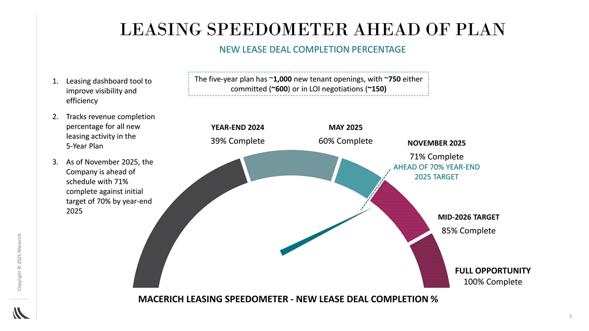 RECORD-BREAKING LEASING ACTIVITY STRONG LEASING PRODUCTIVITY & MOMENTUM Strong leasing volumes and productivity (1) (1) FY 2024 YTD 3Q25 3.2M 5.4M New and Renewal Space Signed 789 888 Signed Leases 197 195 Store Openings 65 65 New-to-Macerich Brands (2) Leased Occupancy as of 4Q24 vs. 3Q25 94.6% 94.3% Go-Forward 92.0% 90.4% Go-Forward Physical Occupancy as of 4Q24 vs. 3Q25 Executive Leasing Committee has reviewed 61% more new deals by count and 128% more by square footage 2025 year-to-date than during the same period last year (1) Both periods represent the Total Portfolio as of September 30, 2025, unless otherwise noted. 3 (2) The Company's Go-Forward Portfolio Centers represents the assets included in the go-forward portfolio as described in the Path Forward Plan, which can be found on the Company's website at https://investing.macerich.com/. The Go-Forward Portfolio Centers are subject to change. Copyright © 2025 Macerich