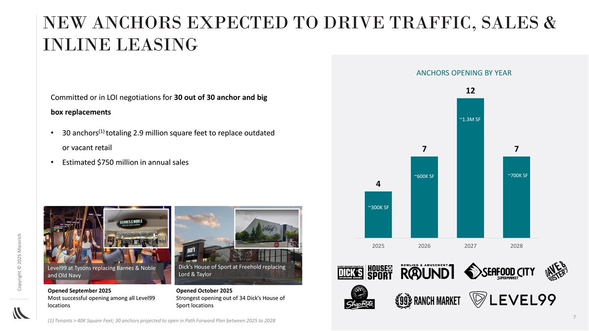 SUBSTANTIAL LEASING PIPELINE TO DRIVE GROWTH SIGNED NOT OPEN (SNO) PIPELINE SUMMARY (1) ~$100 million of in-place SNO committed – Includes new store leases which have or will commence from 2024 through 2028, and are expected to produce total gross revenue of ~$100 million in excess of the revenue generated in the same spaces during 2024 ~$140 million in cumulative total SNO potential - On track to achieve the ultimate opportunity of ~$140 million in cumulative SNO potential, representing an additional ~$40 million to the current committed SNO pipeline of ~$100 million ~$140 MILLION SNO PIPELINE – ESTIMATED ANNUAL CONTRIBUTION $140 $45-50 $40 $40-45 $10-15 $30 $25-30 $20 $100 $30 $30 $20 $20 (ii) 2025 2026 2027 2028 Total 2025 - 2028 Not at scale Committed Uncommitted Data as of November 2025 (1) This new store leasing pipeline represents a cumulative estimate and includes open stores, leases signed not open and leases in documentation. The amounts are based on the permanent tenant revenues in the Go-Forward 6 Portfolio, including development/redevelopment and excluding anticipated dispositions/give-backs. The Company estimates the SNO flow through to NOI to be approximately 80%. (2) Through 3Q25, ~$15 million of SNO realized (against ~20 million estimate for 2025). Copyright © 2025 Macerich ($ in millions)