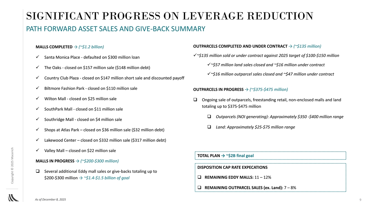 Path Forward Plan estimated to increase permanent occupancy by 500bps ü Curated mix of top-tier and emerging brands – elevating the customer PATH FORWARD PLAN PROJECTED experience PERMANENT PHYSICAL OCCUPANCY ü Boost traffic and engagement – maximizing center productivity 100% ü Significant rent uplift when converting temporary to permanent 95% 95% 95% 94% 94% 94% 94% 91% 91% 6% 90% 90% (1) 90% 89% 6% 8% 8% 7% 85% 88% 80% 85% 83% 82% 82% 75% 2024 2025 2026 2027 2028 Permanent Occupancy Temporary Occupancy Leased Occupancy The Go-Forward Portfolio Physical Occupancy represents the average percentage of occupied mall and freestanding GLA projected for each year. The Go-Forward Portfolio Leased Occupancy represents the average percentage of 8 leased (including signed not open) mall and freestanding GLA projected for each year. (1) Total Physical Occupancy temporary decrease primarily in 1H26 resulting from planned downtime for new permanent tenants (build-outs and under construction). Copyright © 2025 Macerich
