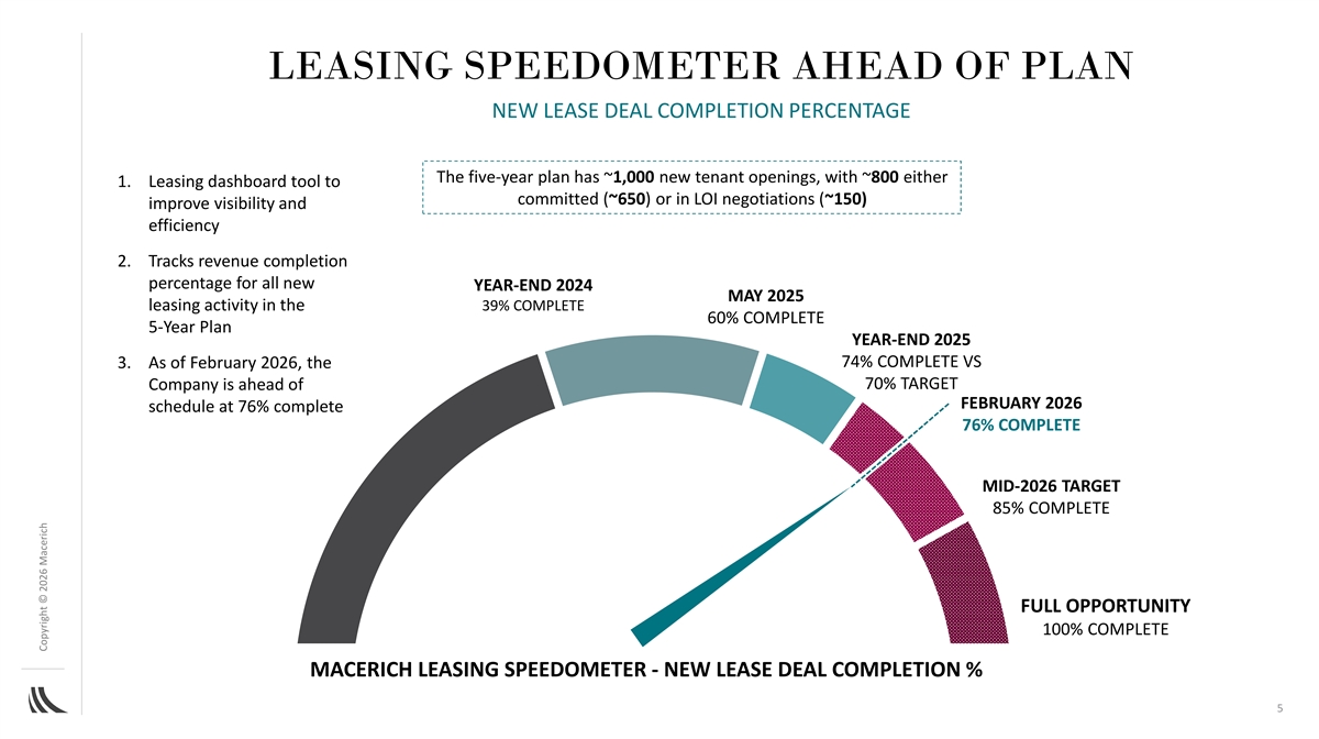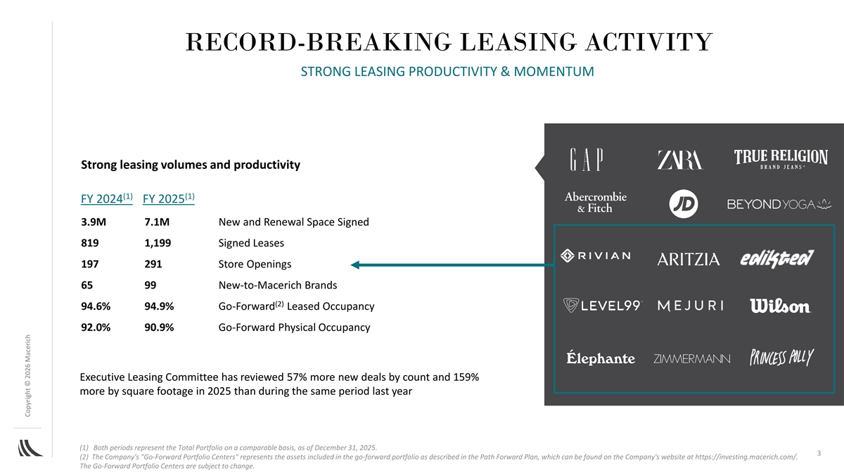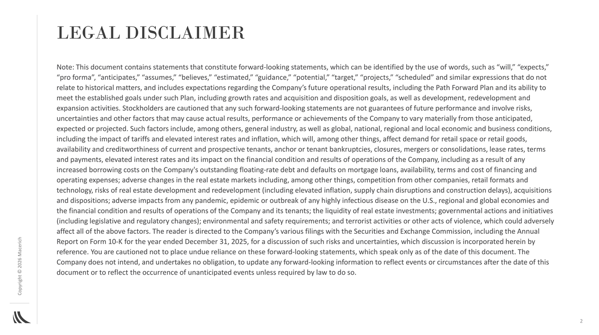 LEGAL DISCLAIMER Note: This document contains statements that constitute forward-looking statements, which can be identified by the use of words, such as “will,” “expects,” “pro forma”, “anticipates,” “assumes,” “believes,” “estimated,” “guidance,” “potential,” “target,” “projects,” “scheduled” and similar expressions that do not relate to historical matters, and includes expectations regarding the Company’s future operational results, including the Path Forward Plan and its ability to meet the established goals under such Plan, including growth rates and acquisition and disposition goals, as well as development, redevelopment and expansion activities. Stockholders are cautioned that any such forward-looking statements are not guarantees of future performance and involve risks, uncertainties and other factors that may cause actual results, performance or achievements of the Company to vary materially from those anticipated, expected or projected. Such factors include, among others, general industry, as well as global, national, regional and local economic and business conditions, including the impact of tariffs and elevated interest rates and inflation, which will, among other things, affect demand for retail space or retail goods, availability and creditworthiness of current and prospective tenants, anchor or tenant bankruptcies, closures, mergers or consolidations, lease rates, terms and payments, elevated interest rates and its impact on the financial condition and results of operations of the Company, including as a result of any increased borrowing costs on the Company's outstanding floating-rate debt and defaults on mortgage loans, availability, terms and cost of financing and operating expenses; adverse changes in the real estate markets including, among other things, competition from other companies, retail formats and technology, risks of real estate development and redevelopment (including elevated inflation, supply chain disruptions and construction delays), acquisitions and dispositions; adverse impacts from any pandemic, epidemic or outbreak of any highly infectious disease on the U.S., regional and global economies and the financial condition and results of operations of the Company and its tenants; the liquidity of real estate investments; governmental actions and initiatives (including legislative and regulatory changes); environmental and safety requirements; and terrorist activities or other acts of violence, which could adversely affect all of the above factors. The reader is directed to the Company’s various filings with the Securities and Exchange Commission, including the Annual Report on Form 10-K for the year ended December 31, 2025, for a discussion of such risks and uncertainties, which discussion is incorporated herein by reference. You are cautioned not to place undue reliance on these forward-looking statements, which speak only as of the date of this document. The Company does not intend, and undertakes no obligation, to update any forward-looking information to reflect events or circumstances after the date of this document or to reflect the occurrence of unanticipated events unless required by law to do so. 2 Copyright © 2026 Macerich