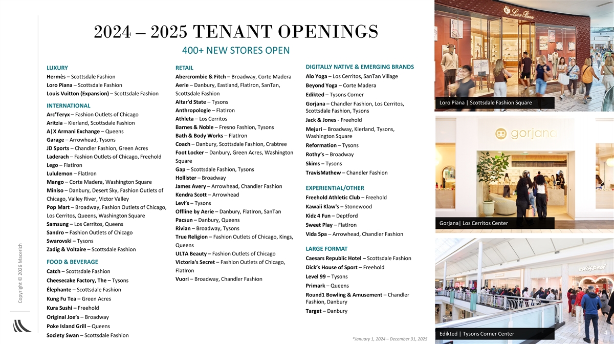 2024 – 2025 TENANT OPENINGS 400+ NEW STORES OPEN DIGITALLY NATIVE & EMERGING BRANDS LUXURY RETAIL Hermès – Scottsdale Fashion Abercrombie & Fitch – Broadway, Corte Madera Alo Yoga – Los Cerritos, SanTan Village Loro Piana – Scottsdale Fashion Aerie – Danbury, Eastland, FlatIron, SanTan, Beyond Yoga – Corte Madera Louis Vuitton (Expansion) – Scottsdale Fashion Scottsdale Fashion Edikted – Tysons Corner Altar'd State – Tysons Loro Piana | Scottsdale Fashion Square Gorjana – Chandler Fashion, Los Cerritos, INTERNATIONAL Anthropologie – FlatIron Scottsdale Fashion, Tysons Arc'Teryx – Fashion Outlets of Chicago Athleta – Los Cerritos Jack & Jones - Freehold Aritzia – Kierland, Scottsdale Fashion Barnes & Noble – Fresno Fashion, Tysons Mejuri – Broadway, Kierland, Tysons, A|X Armani Exchange – Queens Bath & Body Works – FlatIron Washington Square Garage – Arrowhead, Tysons Coach – Danbury, Scottsdale Fashion, Crabtree Reformation – Tysons JD Sports – Chandler Fashion, Green Acres Foot Locker – Danbury, Green Acres, Washington Rothy’s – Broadway Laderach – Fashion Outlets of Chicago, Freehold Square Skims – Tysons Lego – FlatIron Gap – Scottsdale Fashion, Tysons TravisMathew – Chandler Fashion Lululemon – FlatIron Hollister – Broadway Mango – Corte Madera, Washington Square James Avery – Arrowhead, Chandler Fashion EXPERIENTIAL/OTHER Miniso – Danbury, Desert Sky, Fashion Outlets of Kendra Scott – Arrowhead Freehold Athletic Club – Freehold Chicago, Valley River, Victor Valley Levi’s – Tysons Kawaii Klaw's – Stonewood Pop Mart – Broadway, Fashion Outlets of Chicago, Offline by Aerie – Danbury, FlatIron, SanTan Los Cerritos, Queens, Washington Square Kidz 4 Fun – Deptford Pacsun – Danbury, Queens Gorjana| Los Cerritos Center Samsung – Los Cerritos, Queens Sweet Play – FlatIron Rivian – Broadway, Tysons Sandro – Fashion Outlets of Chicago Vida Spa – Arrowhead, Chandler Fashion True Religion – Fashion Outlets of Chicago, Kings, Swarovski – Tysons Queens LARGE FORMAT Zadig & Voltaire – Scottsdale Fashion ULTA Beauty – Fashion Outlets of Chicago Caesars Republic Hotel – Scottsdale Fashion FOOD & BEVERAGE Victoria's Secret – Fashion Outlets of Chicago, Dick’s House of Sport – Freehold FlatIron Catch – Scottsdale Fashion Level 99 – Tysons Vuori – Broadway, Chandler Fashion Cheesecake Factory, The – Tysons Primark – Queens Élephante – Scottsdale Fashion Round1 Bowling & Amusement – Chandler Kung Fu Tea – Green Acres Fashion, Danbury Kura Sushi – Freehold Target – Danbury Original Joe’s – Broadway Poke Island Grill – Queens 4 Edikted | Tysons Corner Center Society Swan – Scottsdale Fashion *January 1, 2024 – December 31, 2025 Copyright © 2026 Macerich