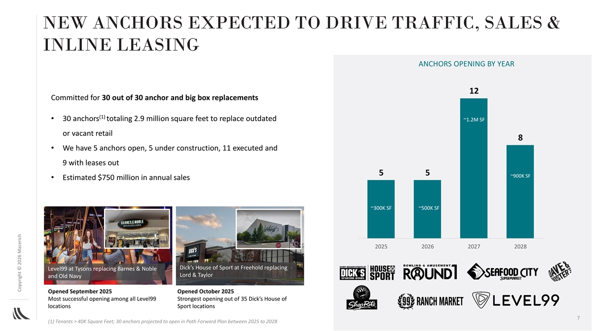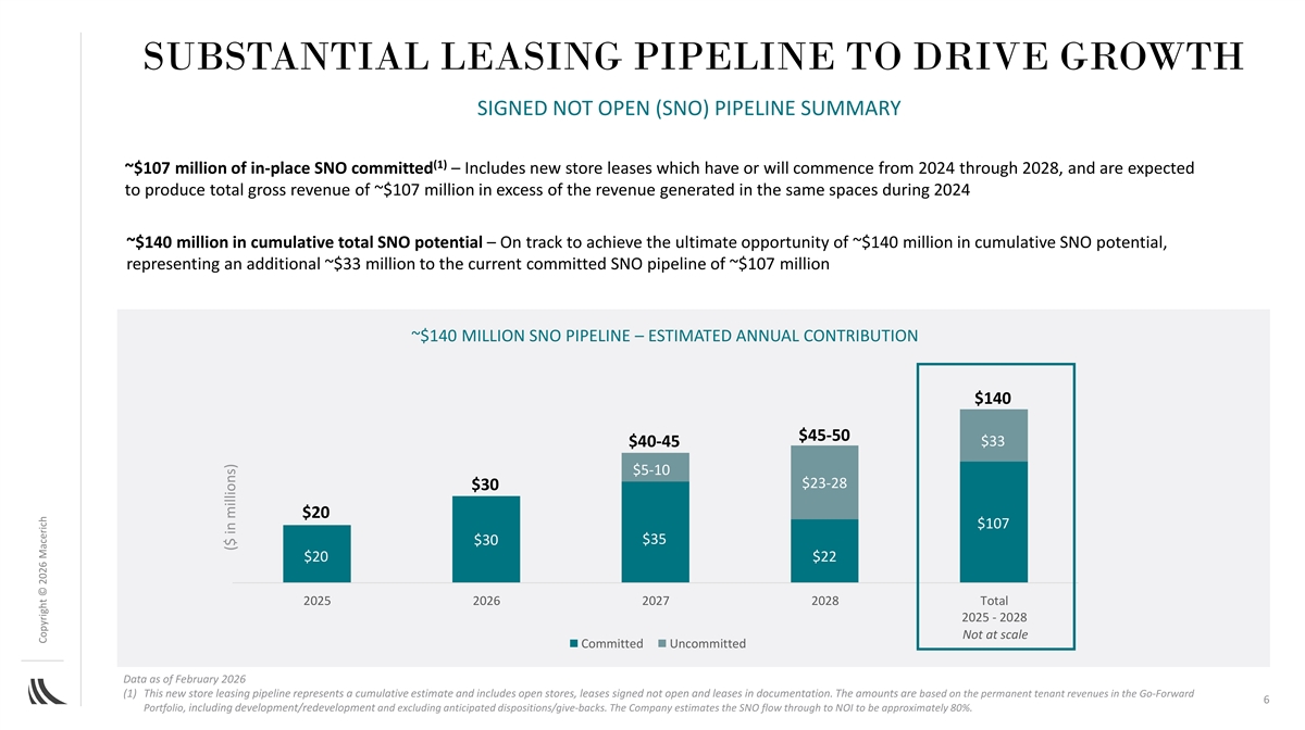 SUBSTANTIAL LEASING PIPELINE TO DRIVE GROWTH SIGNED NOT OPEN (SNO) PIPELINE SUMMARY (1) ~$107 million of in-place SNO committed – Includes new store leases which have or will commence from 2024 through 2028, and are expected to produce total gross revenue of ~$107 million in excess of the revenue generated in the same spaces during 2024 ~$140 million in cumulative total SNO potential – On track to achieve the ultimate opportunity of ~$140 million in cumulative SNO potential, representing an additional ~$33 million to the current committed SNO pipeline of ~$107 million ~$140 MILLION SNO PIPELINE – ESTIMATED ANNUAL CONTRIBUTION $140 $45-50 $33 $40-45 $5-10 $23-28 $30 $20 $107 $35 $30 $20 $22 2025 2026 2027 2028 Total 2025 - 2028 Not at scale Committed Uncommitted Data as of February 2026 (1) This new store leasing pipeline represents a cumulative estimate and includes open stores, leases signed not open and leases in documentation. The amounts are based on the permanent tenant revenues in the Go-Forward 6 Portfolio, including development/redevelopment and excluding anticipated dispositions/give-backs. The Company estimates the SNO flow through to NOI to be approximately 80%. Copyright © 2026 Macerich ($ in millions)