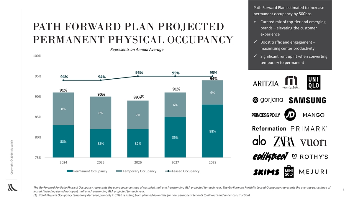 Path Forward Plan estimated to increase permanent occupancy by 500bps ü Curated mix of top-tier and emerging brands – elevating the customer PATH FORWARD PLAN PROJECTED experience PERMANENT PHYSICAL OCCUPANCY ü Boost traffic and engagement – maximizing center productivity Represents an Annual Average 100% ü Significant rent uplift when converting temporary to permanent 95% 95% 95% 95% 94% 94% 94% 91% 91% 6% 90% 90% (1) 90% 89% 6% 8% 8% 7% 85% 88% 80% 85% 83% 82% 82% 75% 2024 2025 2026 2027 2028 Permanent Occupancy Temporary Occupancy Leased Occupancy The Go-Forward Portfolio Physical Occupancy represents the average percentage of occupied mall and freestanding GLA projected for each year. The Go-Forward Portfolio Leased Occupancy represents the average percentage of 8 leased (including signed not open) mall and freestanding GLA projected for each year. (1) Total Physical Occupancy temporary decrease primarily in 1H26 resulting from planned downtime for new permanent tenants (build-outs and under construction). Copyright © 2026 Macerich