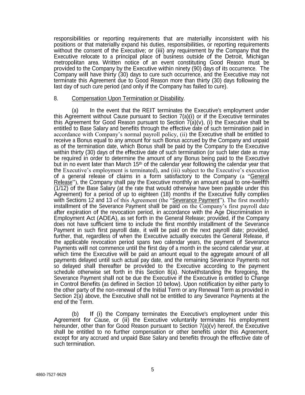5 4860-7527-9629 responsibilities or reporting requirements that are materially inconsistent with his positions or that materially expand his duties, responsibilities, or reporting requirements without the consent of the Executive; or (iii) any requirement by the Company that the Executive relocate to a principal place of business outside of the Detroit, Michigan metropolitan area. Written notice of an event constituting Good Reason must be provided to the Company by the Executive within ninety (90) days of its occurrence. The Company will have thirty (30) days to cure such occurrence, and the Executive may not terminate this Agreement due to Good Reason more than thirty (30) days following the last day of such cure period (and only if the Company has failed to cure). 8. Compensation Upon Termination or Disability. (a) In the event that the REIT terminates the Executive's employment under this Agreement without Cause pursuant to Section 7(a)(i) or if the Executive terminates this Agreement for Good Reason pursuant to Section 7(a)(v), (i) the Executive shall be entitled to Base Salary and benefits through the effective date of such termination paid in accordance with Company’s normal payroll policy, (ii) the Executive shall be entitled to receive a Bonus equal to any amount for such Bonus accrued by the Company and unpaid as of the termination date, which Bonus shall be paid by the Company to the Executive within thirty (30) days of the effective date of such termination (or such later date as may be required in order to determine the amount of any Bonus being paid to the Executive but in no event later than March 15th of the calendar year following the calendar year that the Executive’s employment is terminated), and (iii) subject to the Executive’s execution of a general release of claims in a form satisfactory to the Company (a “General Release”), the Company shall pay the Executive monthly an amount equal to one-twelfth (1/12) of the Base Salary (at the rate that would otherwise have been payable under this Agreement) for a period of up to eighteen (18) months if the Executive fully complies with Sections 12 and 13 of this Agreement (the “Severance Payment”). The first monthly installment of the Severance Payment shall be paid on the Company’s first payroll date after expiration of the revocation period, in accordance with the Age Discrimination in Employment Act (ADEA), as set forth in the General Release; provided, if the Company does not have sufficient time to include the first monthly installment of the Severance Payment in such first payroll date, it will be paid on the next payroll date; provided, further, that, regardless of when the Executive actually executes the General Release, if the applicable revocation period spans two calendar years, the payment of Severance Payments will not commence until the first day of a month in the second calendar year, at which time the Executive will be paid an amount equal to the aggregate amount of all payments delayed until such actual pay date, and the remaining Severance Payments not so delayed shall thereafter be provided to the Executive according to the payment schedule otherwise set forth in this Section 8(a). Notwithstanding the foregoing, the Severance Payment shall not be due the Executive if the Executive is entitled to Change in Control Benefits (as defined in Section 10 below). Upon notification by either party to the other party of the non-renewal of the Initial Term or any Renewal Term as provided in Section 2(a) above, the Executive shall not be entitled to any Severance Payments at the end of the Term. (b) If (i) the Company terminates the Executive's employment under this Agreement for Cause, or (ii) the Executive voluntarily terminates his employment hereunder, other than for Good Reason pursuant to Section 7(a)(v) hereof, the Executive shall be entitled to no further compensation or other benefits under this Agreement, except for any accrued and unpaid Base Salary and benefits through the effective date of such termination.