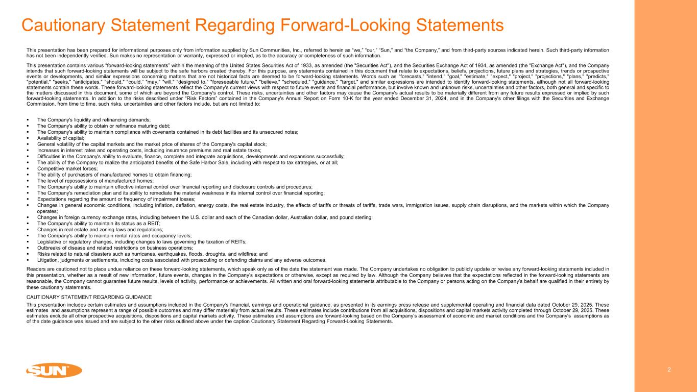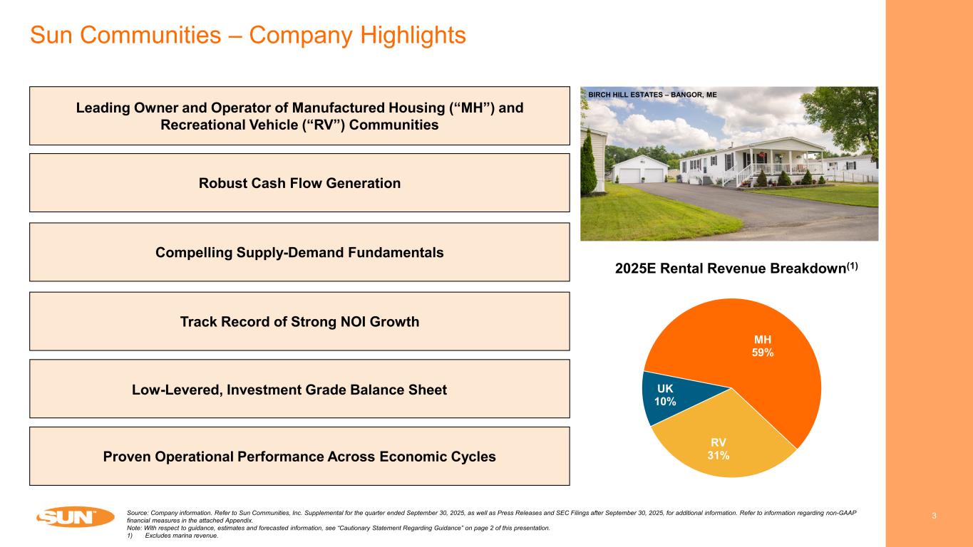 Cautionary Statement Regarding Forward-Looking Statements 2 This presentation has been prepared for informational purposes only from information supplied by Sun Communities, Inc., referred to herein as “we,” “our,” “Sun,” and “the Company,” and from third-party sources indicated herein. Such third-party information has not been independently verified. Sun makes no representation or warranty, expressed or implied, as to the accuracy or completeness of such information. This presentation contains various “forward-looking statements” within the meaning of the United States Securities Act of 1933, as amended (the "Securities Act"), and the Securities Exchange Act of 1934, as amended (the "Exchange Act"), and the Company intends that such forward-looking statements will be subject to the safe harbors created thereby. For this purpose, any statements contained in this document that relate to expectations, beliefs, projections, future plans and strategies, trends or prospective events or developments, and similar expressions concerning matters that are not historical facts are deemed to be forward-looking statements. Words such as "forecasts," "intend," "goal," "estimate," "expect," "project," "projections," "plans," "predicts," "potential," "seeks," "anticipates," "should," "could,“ "may," "will," "designed to," "foreseeable future," "believe," "scheduled," "guidance," "target," and similar expressions are intended to identify forward-looking statements, although not all forward-looking statements contain these words. These forward-looking statements reflect the Company's current views with respect to future events and financial performance, but involve known and unknown risks, uncertainties and other factors, both general and specific to the matters discussed in this document, some of which are beyond the Company's control. These risks, uncertainties and other factors may cause the Company's actual results to be materially different from any future results expressed or implied by such forward-looking statements. In addition to the risks described under "Risk Factors” contained in the Company's Annual Report on Form 10-K for the year ended December 31, 2024, and in the Company's other filings with the Securities and Exchange Commission, from time to time, such risks, uncertainties and other factors include, but are not limited to: The Company's liquidity and refinancing demands; The Company's ability to obtain or refinance maturing debt; The Company's ability to maintain compliance with covenants contained in its debt facilities and its unsecured notes; Availability of capital; General volatility of the capital markets and the market price of shares of the Company's capital stock; Increases in interest rates and operating costs, including insurance premiums and real estate taxes; Difficulties in the Company's ability to evaluate, finance, complete and integrate acquisitions, developments and expansions successfully; The ability of the Company to realize the anticipated benefits of the Safe Harbor Sale, including with respect to tax strategies, or at all; Competitive market forces; The ability of purchasers of manufactured homes to obtain financing; The level of repossessions of manufactured homes; The Company's ability to maintain effective internal control over financial reporting and disclosure controls and procedures; The Company's remediation plan and its ability to remediate the material weakness in its internal control over financial reporting; Expectations regarding the amount or frequency of impairment losses; Changes in general economic conditions, including inflation, deflation, energy costs, the real estate industry, the effects of tariffs or threats of tariffs, trade wars, immigration issues, supply chain disruptions, and the markets within which the Company operates; Changes in foreign currency exchange rates, including between the U.S. dollar and each of the Canadian dollar, Australian dollar, and pound sterling; The Company's ability to maintain its status as a REIT; Changes in real estate and zoning laws and regulations; The Company's ability to maintain rental rates and occupancy levels; Legislative or regulatory changes, including changes to laws governing the taxation of REITs; Outbreaks of disease and related restrictions on business operations; Risks related to natural disasters such as hurricanes, earthquakes, floods, droughts, and wildfires; and Litigation, judgments or settlements, including costs associated with prosecuting or defending claims and any adverse outcomes. Readers are cautioned not to place undue reliance on these forward-looking statements, which speak only as of the date the statement was made. The Company undertakes no obligation to publicly update or revise any forward-looking statements included in this presentation, whether as a result of new information, future events, changes in the Company’s expectations or otherwise, except as required by law. Although the Company believes that the expectations reflected in the forward-looking statements are reasonable, the Company cannot guarantee future results, levels of activity, performance or achievements. All written and oral forward-looking statements attributable to the Company or persons acting on the Company’s behalf are qualified in their entirety by these cautionary statements. CAUTIONARY STATEMENT REGARDING GUIDANCE This presentation includes certain estimates and assumptions included in the Company’s financial, earnings and operational guidance, as presented in its earnings press release and supplemental operating and financial data dated October 29, 2025. These estimates and assumptions represent a range of possible outcomes and may differ materially from actual results. These estimates include contributions from all acquisitions, dispositions and capital markets activity completed through October 29, 2025. These estimates exclude all other prospective acquisitions, d