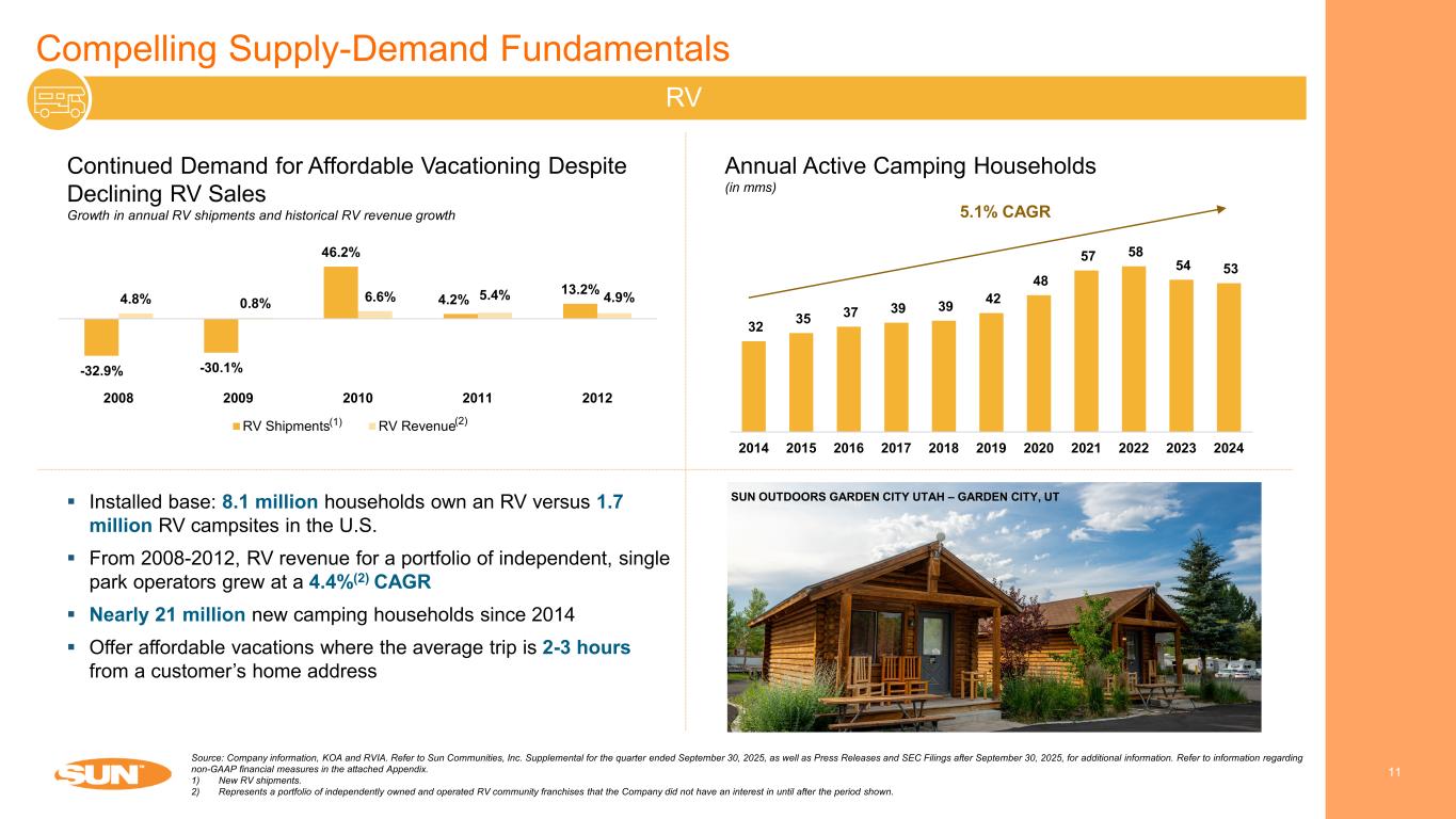 Compelling Supply-Demand Fundamentals 10 MH – North America Source: Company information, U.S. Bureau of Labor Statistics., Wall Street Research and Zillow. Refer to Sun Communities, Inc. Supplemental for the quarter ended September 30, 2025, as well as Press Releases and SEC Filings after September 30, 2025, for additional information. Refer to information regarding non-GAAP financial measures in the attached Appendix. 1) Source: Wolfe Research, CoStar, and NIC Map. 2) MH sites in North America only (January 2023 – September 2025). Virtually no new supply has been added for years 25% more space than multi-family and single-family rentals at ~50% less cost per square foot Average resident tenure of ~21 years(2) generates steady, growing rental revenue, then home generally sells in place Annual home move-outs average 0.4%(2) 98.0% occupied at September 30, 2025 96.9% average occupancy for the five years ended September 30, 2025 Demand Supply(1) Residents Moved into MH Communities in Record Numbers US unemployment rate and SUI same property occupancy through GFC PINE ACRE TRAILS – CONROE, TX 5.8% 9.3% 9.6% 8.9% 8.1% 76% 80% 84% 88% 0% 4% 8% 12% 2008 2009 2010 2011 2012 SU I S am e Pr op er ty O cc up an cy U S U ne m pl oy m en t R at e US Unemployment Rate SUI Same Property Occupancy 0% 2% 4% 6% 2015 2016 2017 2018 2019 2020 2021 2022 2023 2024 US Inventory Growth by Property Type Manufactured Housing Office Retail Multifamily Industrial Storage
