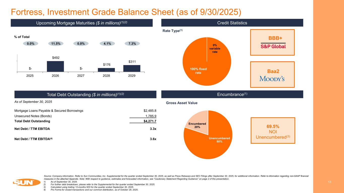 Compelling Supply-Demand Fundamentals 12 UK Source: Company information, Wall Street Research and Zillow. Refer to Sun Communities, Inc. Supplemental for the quarter ended September 30, 2025, as well as Press Releases and SEC Filings after September 30, 2025, for additional information. Refer to information regarding non-GAAP financial measures in the attached Appendix. Note: With respect to guidance, estimates and forecasted information, see “Cautionary Statement Regarding Guidance” on page 2 of this presentation. Strategic goal of increasing real property NOI contribution Strong historical and expected income growth 10-year average rental rate increase of 5.2% Expecting 4.1% rental rate increase in 2026 Home Sales NOI: Resident turnover in communities is largest driver of home sales volume (~60%) Upgrade existing residents (~20%) Select communities expansions (~10%) Transient-to-annual conversions (~10%) Irreplaceable coastal ‘destination’ locations close to London and other major cities Numerous barriers to entry including strict regulations and scarcity of land Brexit and other macroeconomic structural factors create demand for domestic vacationing throughout the UK Majority of parks are owner-occupied on 20+ year licenses subject to annual rent increases Average resident tenure 7 - 8 years Supply & DemandBusiness Model STEEPLE BAY – ESSEX, UK