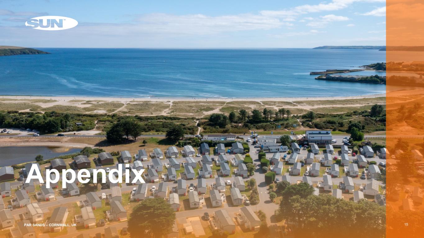 Robust Sustainability Initiatives(1) 14 Environmental Committed to sustainable business practices that benefit all stakeholders including the communities in which we operate Current initiatives include policy enhancement, environmental targets and data coverage Received “C,” Prime status rating by ISS ESG, placing us among top ESG performers in our REIT peer group Social Internal Training Program Offers 300+ courses to team members IDEA Launched three employee resource groups Governance BoD Composition Mark Denien elected to the Board of Directors & Charles Young appointed Oct 1 Enterprise Risk Management Committee Identifies, monitors and mitigates risks across the organization Supplier Assessments Completed sustainability assessments with seventeen key suppliers BoD Nominating and Corporate Governance Committee Oversees all Sustainability initiatives Sun Unity Sun’s social responsibility program, reporting over 17K volunteer hours in 2024 Comprehensive Policies and Procedures Foster sound corporate governance Source: Company information. Refer to Sun Communities, Inc. Supplemental for the quarter ended September 30, 2025, as well as Press Releases and SEC Filings after September 30, 2025, for additional information. Refer to information regarding non-GAAP financial measures in the attached Appendix. 1) Performance and initiatives for the 2024 reporting year are referenced with Safe Harbor Marina data removed from reported numbers. On-site renewable energy Generated 11,652 mwh via on-site solar arrays; 4% of total electric Carbon Reduction Goals Achieved 60% reduction towards Carbon Neutral by 2035 goal GHG Inventory Assurance Received reasonable assurance on Scope 1, 2 and 3 inventory Risk Assessments Completed climate, water and biodiversity risks assessments on all properties