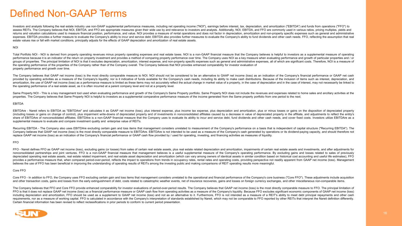 Defined Non-GAAP Terms 16 Investors and analysts following the real estate industry use non-GAAP supplemental performance measures, including net operating income ("NOI"), earnings before interest, tax, depreciation, and amortization ("EBITDA") and funds from operations ("FFO") to assess REITs. The Company believes that NOI, EBITDA, and FFO are appropriate measures given their wide use by and relevance to investors and analysts. Additionally, NOI, EBITDA, and FFO are commonly used in various ratios, pricing multiples, yields and returns and valuation calculations used to measure financial position, performance, and value. NOI provides a measure of rental operations and does not factor in depreciation, amortization and non-property specific expenses such as general and administrative expenses. EBITDA provides a further measure to evaluate the Company's ability to incur and service debt; EBITDA also provides further measures to evaluate the Company's ability to fund dividends and other cash needs. FFO, reflecting the assumption that real estate values rise or fall with market conditions, principally adjusts for the effects of GAAP depreciation and amortization of real estate assets. NOI Total Portfolio NOI - NOI is derived from property operating revenues minus property operating expenses and real estate taxes. NOI is a non-GAAP financial measure that the Company believes is helpful to investors as a supplemental measure of operating performance because it is an indicator of the return on property investment and provides a method of comparing property performance over time. The Company uses NOI as a key measure when evaluating performance and growth of particular properties and / or groups of properties. The principal limitation of NOI is that it excludes depreciation, amortization, interest expense, and non-property specific expenses such as general and administrative expenses, all of which are significant costs. Therefore, NOI is a measure of the operating performance of the properties of the Company rather than of the Company overall. The Company believes that NOI provides enhanced comparability for investor evaluation of property performance and growth over time. The Company believes that GAAP net income (loss) is the most directly comparable measure to NOI. NOI should not be considered to be an alternative to GAAP net income (loss) as an indication of the Company's financial performance or GAAP net cash provided by operating activities as a measure of the Company's liquidity; nor is it indicative of funds available for the Company's cash needs, including its ability to make cash distributions. Because of the inclusion of items such as interest, depreciation, and amortization, the use of GAAP net income (loss) as a performance measure is limited as these items may not accurately reflect the actual change in market value of a property, in the case of depreciation and in the case of interest, may not necessarily be linked to the operating performance of a real estate asset, as it is often incurred at a parent company level and not at a property level. Same Property NOI - This is a key management tool used when evaluating performance and growth of the Company's Same Property portfolio. Same Property NOI does not include the revenues and expenses related to home sales and ancillary activities at the properties. The Company believes that Same Property NOI is helpful to investors as a supplemental comparative performance measure of the income generated from the Same property portfolio from one period to the next. EBITDA EBITDAre - Nareit refers to EBITDA as "EBITDAre" and calculates it as GAAP net income (loss), plus interest expense, plus income tax expense, plus depreciation and amortization, plus or minus losses or gains on the disposition of depreciated property (including losses or gains on change of control), plus impairment write-downs of depreciated property and of investments in nonconsolidated affiliates caused by a decrease in value of depreciated property in the affiliate, and adjustments to reflect the entity's share of EBITDAre of nonconsolidated affiliates. EBITDAre is a non-GAAP financial measure that the Company uses to evaluate its ability to incur and service debt, fund dividends and other cash needs, and cover fixed costs. Investors utilize EBITDAre as a supplemental measure to evaluate and compare investment quality and enterprise value of REITs. Recurring EBITDA - The Company also uses EBITDAre excluding certain gain and loss items that management considers unrelated to measurement of the Company's performance on a basis that is independent of capital structure ("Recurring EBITDA"). The Company believes that GAAP net income (loss) is the most directly comparable measure to EBITDAre. EBITDAre is not intended to be used as a measure of the Company's cash generated by operations or its dividend-paying capacity, and should therefore not replace GAAP net income (loss) as an indication of the Company's financial performance or GAAP cash flow provided by / used for operating, investing, and financing activities as measures of liquidity. FFO FFO - Nareit defines FFO as GAAP net income (loss), excluding gains (or losses) from sales of certain real estate assets, plus real estate related depreciation and amortization, impairments of certain real estate assets and investments, and after adjustments for nonconsolidated partnerships and joint ventures. FFO is a non-GAAP financial measure that management believes is a useful supplemental measure of the Company's operating performance. By excluding gains and losses related to sales of previously depreciated operating real estate assets, real estate related impairment, and real estate asset depreciation and amortization (which can vary among owners of identical assets in similar condition based on historical cost accounting and useful life estimates), FFO provides a performance measure that, when compared period-over-period, reflects t