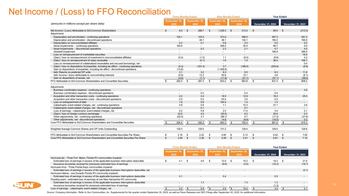17 Source: Company information. Refer to Sun Communities, Inc. Supplemental for the quarter ended September 30, 2025, as well as Press Releases and SEC Filings after September 30, 2025, for additional information. Net Income / (Loss) to FFO Reconciliation (amounts in millions except per share data) September 30, 2025 September 30, 2024 September 30, 2025 September 30, 2024 December 31, 2024 December 31, 2023 Net Income / (Loss) Attributable to SUI Common Shareholders 8.5$ 288.7$ 1,239.3$ 313.4$ 89.0$ (213.3)$ Adjustments Depreciation and amortization - continuing operations 124.1 123.5 373.0 366.0 487.3 491.3 Depreciation and amortization - discontinued operations - 48.1 36.1 142.1 190.2 165.9 Depreciation on nonconsolidated affiliates 0.2 0.1 0.6 0.3 0.5 0.2 Asset impairments - continuing operations 165.9 - 356.0 30.4 66.7 5.6 Asset impairments - discontinued operations - 0.2 2.3 2.1 4.7 4.5 Goodwill impairment - - - - 180.8 369.9 Loss on remeasurement of marketable securities - - - - - 16.0 (Gain) / loss on remeasurement of investment in nonconsolidated affiliates (0.4) (1.2) 1.1 (6.5) (6.6) 4.2 (Gain) / loss on remeasurement of notes receivable - (0.1) 1.6 1.0 36.4 106.7 Loss on remeasurement of collateralized receivables and secured borrowings, net - - - - - 0.4 (Gain) / loss on dispositions of properties, including tax effect - continuing operations (0.3) (181.4) 3.7 (188.5) (203.6) (8.9) Gain on dispositions of properties, including tax effect - discontinued operations (13.8) - (1,458.8) - - - Add: Returns on preferred OP units 3.1 3.2 9.3 9.5 8.3 11.8 Add: Income / (loss) attributable to noncontrolling interests (0.9) 13.3 50.8 15.1 4.8 (8.1) Gain on dispositions of assets, net (3.9) (7.1) (11.8) (21.1) (27.1) (38.0) FFO Attributable to SUI Common Shareholders and Convertible Securities 282.5$ 287.3$ 603.2$ 663.8$ 831.4$ 908.2$ Adjustments Business combination expense - continuing operations - - - - - 3.0 Business combination expense - discontinued operations - 0.2 - 0.4 0.4 - Acquisition and other transaction costs - continuing operations 2.2 2.4 18.5 12.9 19.3 25.3 Acquisition and other transaction costs - discontinued operations 0.5 0.5 63.4 3.0 0.3 - Loss on extinguishment of debt 1.6 0.8 104.0 1.4 1.4 - Catastrophic event-related charges, net - continuing operations 0.8 0.8 1.1 10.3 27.1 3.8 Catastrophic event-related charges, net - discontinued operations - 0.1 - 0.1 - - Loss of earnings - catastrophic event-related charges, net 4.2 5.9 2.5 11.5 3.4 2.1 (Gain) / loss on foreign currency exchanges 22.6 4.5 (25.5) 6.2 25.8 0.3 Other adjustments, net - continuing operations (20.0) 3.7 (88.7) 0.7 (17.2) (27.6) Other adjustments, net - discontinued operations - - 14.8 (9.9) (10.0) 0.2 Core FFO Attributable to SUI Common Shareholders and Convertible Securities 294.4$ 306.2$ 693.3$ 700.4$ 881.9$ 915.3$ Weighted Average Common Shares and OP Units Outstanding 129.3 129.5 131.2 129.4 129.5 128.9 FFO Attributable to SUI Common Shareholders and Convertible Securities Per Share 2.18$ 2.22$ 4.60$ 5.13$ 6.42$ 7.05$ Core FFO Attributable to SUI Common Shareholders and Convertible Securities Per Share 2.28$ 2.36$ 5.28$ 5.41$ 6.81$ 7.10$ September 30, 2025 September 30, 2024 September 30, 2025 September 30, 2024 December 31, 2024 December 31, 2023 Hurricane Ian - Three Fort Myers, Florida RV communities impaired Estimated loss of earnings in excess of the applicable business interruption deductible 4.1$ 4.6$ 12.0$ 15.2$ 19.2$ 21.9$ Insurance recoveries received for previously estimated loss of earnings - - (9.9) (5.0) (16.3) (19.7) Hurricane Irma - Three Florida Keys communities impaired Estimated loss of earnings in excess of the applicable business interruptions deductible, net - - - - - (0.1) Hurricane Helene - one Dunedin Florida RV community impaired Estimated loss of earnings in excess of the applicable business interruptions deductible 0.1 - 0.4 - 0.5 - Flooding event - estimated loss of earnings at one New Hampshire RV community Estimated loss of earnings in excess of the applicable business interruptions deductible - 1.3 - 1.3 1.3 - Insurance recoveries received for previously estimated loss of earnings - - - - (1.3) - Loss of earnings - catastrophic event-related charges, net 4.2$ 5.9$ 2.5$ 10.2$ 3.4$ 2.1$ Year EndedNine Months EndedThree Months Ended Three Months Ended Nine Months Ended Year Ended