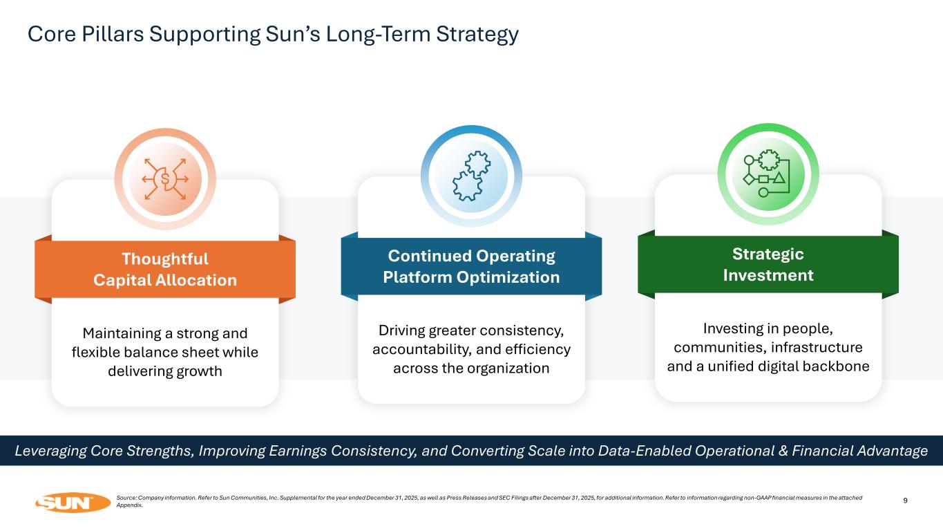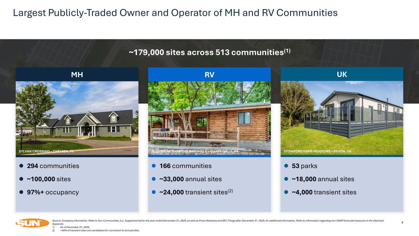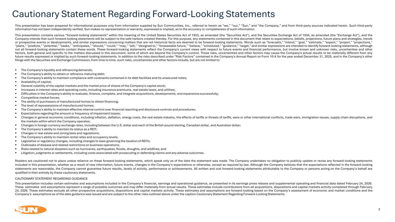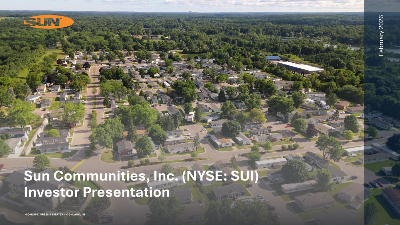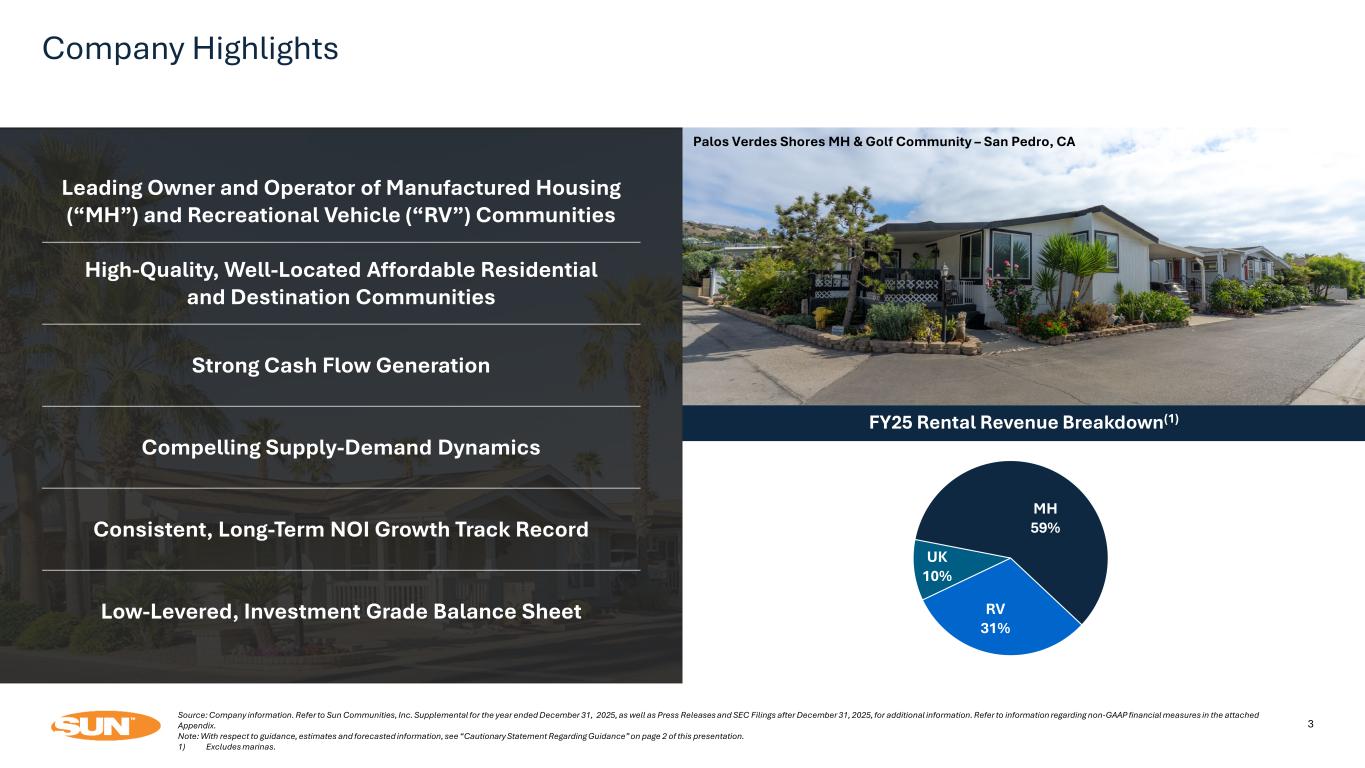 Cautionary Statement Regarding Forward-Looking Statements 2 This presentation has been prepared for informational purposes only from information supplied by Sun Communities, Inc., referred to herein as “we,” “our,” “Sun,” and “the Company,” and from third-party sources indicated herein. Such third-party information has not been independently verified. Sun makes no representation or warranty, expressed or implied, as to the accuracy or completeness of such information. This presentation contains various “forward-looking statements” within the meaning of the United States Securities Act of 1933, as amended (the "Securities Act"), and the Securities Exchange Act of 1934, as amended (the "Exchange Act"), and the Company intends that such forward-looking statements will be subject to the safe harbors created thereby. For this purpose, any statements contained in this document that relate to expectations, beliefs, projections, future plans and strategies, trends or prospective events or developments, and similar expressions concerning matters that are not historical facts are deemed to be forward-looking statements. Words such as "forecasts," "intend," "goal," "estimate," "expect," "project," "projections," "plans," "predicts," "potential," "seeks," "anticipates," "should," "could,“ "may," "will," "designed to," "foreseeable future," "believe," "scheduled," "guidance," "target," and similar expressions are intended to identify forward-looking statements, although not all forward-looking statements contain these words. These forward-looking statements reflect the Company's current views with respect to future events and financial performance, but involve known and unknown risks, uncertainties and other factors, both general and specific to the matters discussed in this document, some of which are beyond the Company's control. These risks, uncertainties and other factors may cause the Company's actual results to be materially different from any future results expressed or implied by such forward-looking statements. In addition to the risks described under "Risk Factors” contained in the Company's Annual Report on Form 10-K for the year ended December 31, 2025, and in the Company's other filings with the Securities and Exchange Commission, from time to time, such risks, uncertainties and other factors include, but are not limited to: The Company's liquidity and refinancing demands; The Company's ability to obtain or refinance maturing debt; The Company's ability to maintain compliance with covenants contained in its debt facilities and its unsecured notes; Availability of capital; General volatility of the capital markets and the market price of shares of the Company's capital stock; Increases in interest rates and operating costs, including insurance premiums, real estate taxes, and utilities; Difficulties in the Company's ability to evaluate, finance, complete, and integrate acquisitions, developments, and expansions successfully; Competitive market forces; The ability of purchasers of manufactured homes to obtain financing; The level of repossessions of manufactured homes; The Company's ability to maintain effective internal control over financial reporting and disclosure controls and procedures; Expectations regarding the amount or frequency of impairment losses; Changes in general economic conditions, including inflation, deflation, energy costs, the real estate industry, the effects of tariffs or threats of tariffs, wars or other international conflicts, trade wars, immigration issues, supply chain disruptions, and the markets within which the Company operates; Changes in foreign currency exchange rates, including between the U.S. dollar and each of the British pound sterling, Canadian dollar, and Australian dollar; The Company’s ability to maintain its status as a REIT; Changes in real estate and zoning laws and regulations; The Company's ability to maintain rental rates and occupancy levels; Legislative or regulatory changes, including changes to laws governing the taxation of REITs; Outbreaks of disease and related restrictions on business operations; Risks related to natural disasters such as hurricanes, earthquakes, floods, droughts, and wildfires; and Litigation, judgments or settlements, including costs associated with prosecuting or defending claims and any adverse outcomes. Readers are cautioned not to place undue reliance on these forward-looking statements, which speak only as of the date the statement was made. The Company undertakes no obligation to publicly update or revise any forward-looking statements included in this presentation, whether as a result of new information, future events, changes in the Company’s expectations or otherwise, except as required by law. Although the Company believes that the expectations reflected in the forward-looking statements are reasonable, the Company cannot guarantee future results, levels of activity, performance or achievements. All written and oral forward-looking statements attributable to the Company or persons acting on the Company’s behalf are qualified in their entirety by these cautionary statements. CAUTIONARY STATEMENT REGARDING GUIDANCE This presentation includes certain estimates and assumptions included in the Company’s financial, earnings and operational guidance, as presented in its earnings press release and supplemental operating and financial data dated February 24, 2026. These estimates and assumptions represent a range of possible outcomes and may differ materially from actual results. These estimates include contributions from all acquisitions, dispositions and capital markets activity completed through February 24, 2026. These estimates exclude all other prospective acquisitions, dispositions and capital markets activity. These estimates and assumptions are forward-looking based on the Company’s assessment of economic and market conditions and the Company’s assumptions as of the da