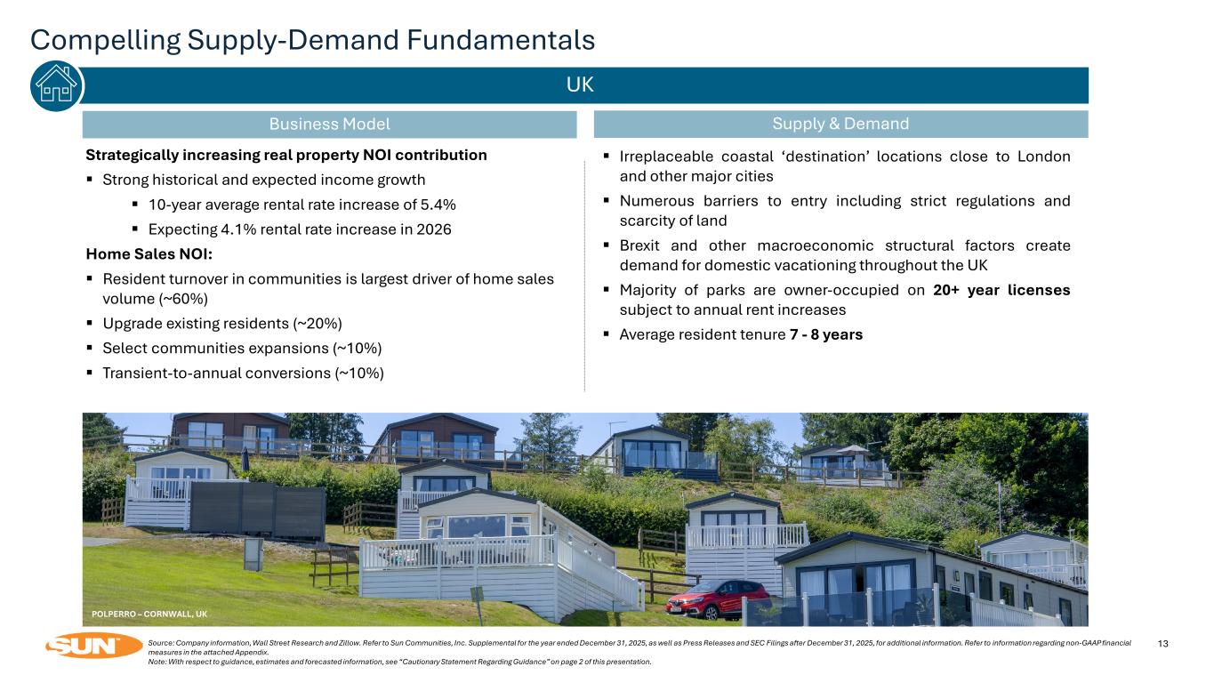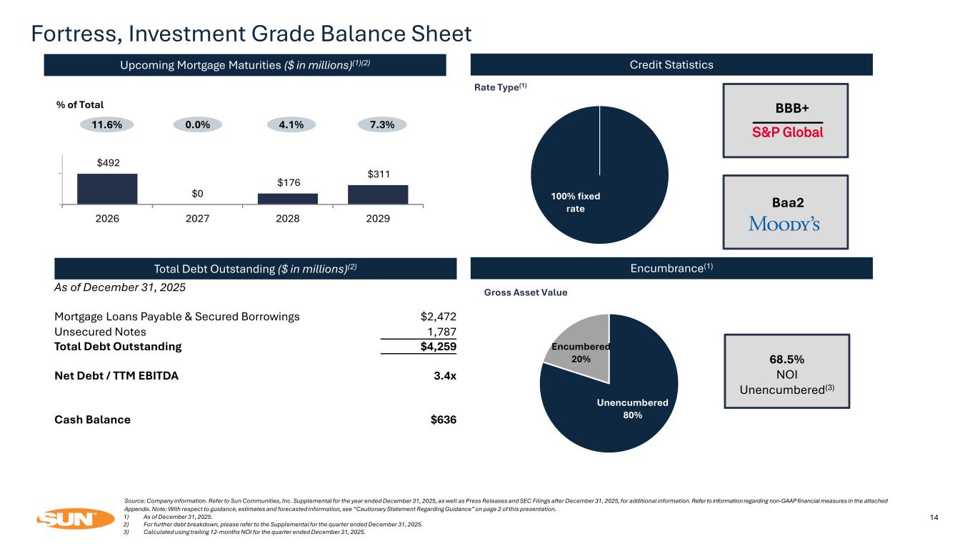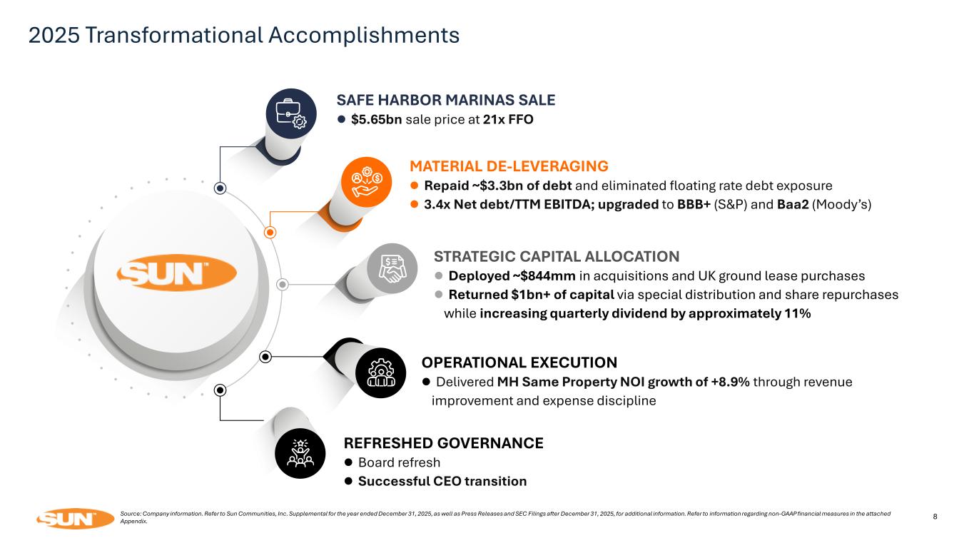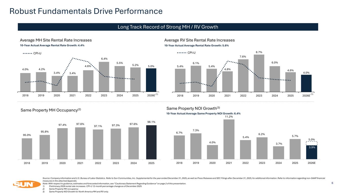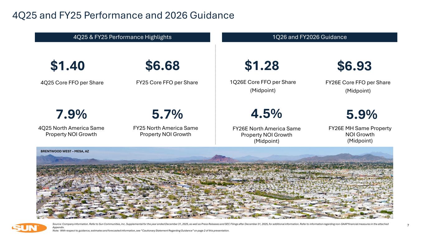 Cautionary Statement Regarding Forward-Looking Statements 2 This presentation has been prepared for informational purposes only from information supplied by Sun Communities, Inc., referred to herein as “we,” “our,” “Sun,” and “the Company,” and from third-party sources indicated herein. Such third-party information has not been independently verified. Sun makes no representation or warranty, expressed or implied, as to the accuracy or completeness of such information. This presentation contains various “forward-looking statements” within the meaning of the United States Securities Act of 1933, as amended (the "Securities Act"), and the Securities Exchange Act of 1934, as amended (the "Exchange Act"), and the Company intends that such forward-looking statements will be subject to the safe harbors created thereby. For this purpose, any statements contained in this document that relate to expectations, beliefs, projections, future plans and strategies, trends or prospective events or developments, and similar expressions concerning matters that are not historical facts are deemed to be forward-looking statements. Words such as "forecasts," "intend," "goal," "estimate," "expect," "project," "projections," "plans," "predicts," "potential," "seeks," "anticipates," "should," "could,“ "may," "will," "designed to," "foreseeable future," "believe," "scheduled," "guidance," "target," and similar expressions are intended to identify forward-looking statements, although not all forward-looking statements contain these words. These forward-looking statements reflect the Company's current views with respect to future events and financial performance, but involve known and unknown risks, uncertainties and other factors, both general and specific to the matters discussed in this document, some of which are beyond the Company's control. These risks, uncertainties and other factors may cause the Company's actual results to be materially different from any future results expressed or implied by such forward-looking statements. In addition to the risks described under "Risk Factors” contained in the Company's Annual Report on Form 10-K for the year ended December 31, 2025, and in the Company's other filings with the Securities and Exchange Commission, from time to time, such risks, uncertainties and other factors include, but are not limited to: The Company's liquidity and refinancing demands; The Company's ability to obtain or refinance maturing debt; The Company's ability to maintain compliance with covenants contained in its debt facilities and its unsecured notes; Availability of capital; General volatility of the capital markets and the market price of shares of the Company's capital stock; Increases in interest rates and operating costs, including insurance premiums, real estate taxes, and utilities; Difficulties in the Company's ability to evaluate, finance, complete, and integrate acquisitions, developments, and expansions successfully; Competitive market forces; The ability of purchasers of manufactured homes to obtain financing; The level of repossessions of manufactured homes; The Company's ability to maintain effective internal control over financial reporting and disclosure controls and procedures; Expectations regarding the amount or frequency of impairment losses; Changes in general economic conditions, including inflation, deflation, energy costs, the real estate industry, the effects of tariffs or threats of tariffs, wars or other international conflicts, trade wars, immigration issues, supply chain disruptions, and the markets within which the Company operates; Changes in foreign currency exchange rates, including between the U.S. dollar and each of the British pound sterling, Canadian dollar, and Australian dollar; The Company’s ability to maintain its status as a REIT; Changes in real estate and zoning laws and regulations; The Company's ability to maintain rental rates and occupancy levels; Legislative or regulatory changes, including changes to laws governing the taxation of REITs; Outbreaks of disease and related restrictions on business operations; Risks related to natural disasters such as hurricanes, earthquakes, floods, droughts, and wildfires; and Litigation, judgments or settlements, including costs associated with prosecuting or defending claims and any adverse outcomes. Readers are cautioned not to place undue reliance on these forward-looking statements, which speak only as of the date the statement was made. The Company undertakes no obligation to publicly update or revise any forward-looking statements included in this presentation, whether as a result of new information, future events, changes in the Company’s expectations or otherwise, except as required by law. Although the Company believes that the expectations reflected in the forward-looking statements are reasonable, the Company cannot guarantee future results, levels of activity, performance or achievements. All written and oral forward-looking statements attributable to the Company or persons acting on the Company’s behalf are qualified in their entirety by these cautionary statements. CAUTIONARY STATEMENT REGARDING GUIDANCE This presentation includes certain estimates and assumptions included in the Company’s financial, earnings and operational guidance, as presented in its earnings press release and supplemental operating and financial data dated February 24, 2026. These estimates and assumptions represent a range of possible outcomes and may differ materially from actual results. These estimates include contributions from all acquisitions, dispositions and capital markets activity completed through February 24, 2026. These estimates exclude all other prospective acquisitions, dispositions and capital markets activity. These estimates and assumptions are forward-looking based on the Company’s assessment of economic and market conditions and the Company’s assumptions as of the da