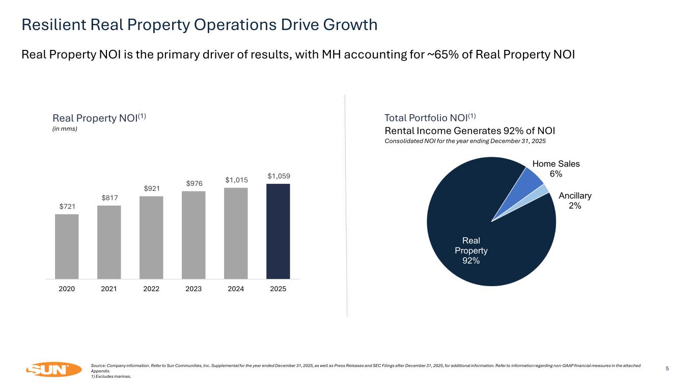 4 UK 294 communities ~100,000 sites 97%+ occupancy 166 communities ~33,000 annual sites ~24,000 transient sites(2) 53 parks ~18,000 annual sites ~4,000 transient sites RVMH ~179,000 sites across 513 communities(1) SYLVAN CROSSING – CHELSEA, MI STOWFORD FARM MEADOWS – DEVON, UKJELLYSTONE PARKTM QUARRYVILLE – QUARRYVILLE, PA Largest Publicly-Traded Owner and Operator of MH and RV Communities Source: Company information. Refer to Sun Communities, Inc. Supplemental for the year ended December 31, 2025, as well as Press Releases and SEC Filings after December 31, 2025, for additional information. Refer to information regarding non-GAAP financial measures in the attached Appendix. 1) As of December 31, 2025. 2) ~50% of transient sites are candidates for conversion to annual sites.