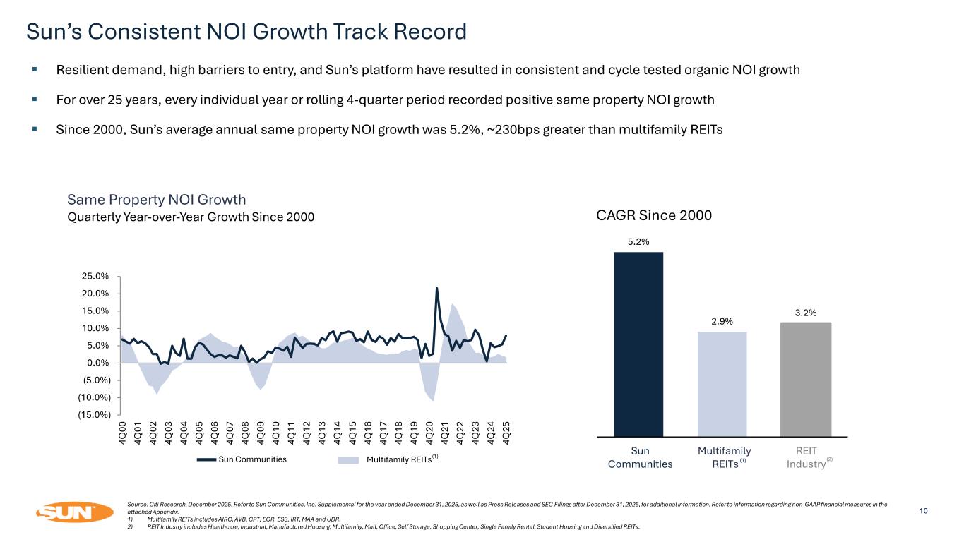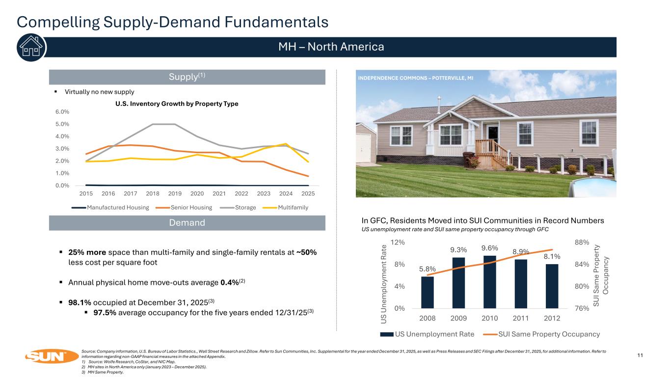 Sun’s Consistent NOI Growth Track Record 10 Multifamily REITsSun Communities Resilient demand, high barriers to entry, and Sun’s platform have resulted in consistent and cycle tested organic NOI growth For over 25 years, every individual year or rolling 4-quarter period recorded positive same property NOI growth Since 2000, Sun’s average annual same property NOI growth was 5.2%, ~230bps greater than multifamily REITs Same Property NOI Growth Quarterly Year-over-Year Growth Since 2000 Source: Citi Research, December 2025. Refer to Sun Communities, Inc. Supplemental for the year ended December 31, 2025, as well as Press Releases and SEC Filings after December 31, 2025, for additional information. Refer to information regarding non-GAAP financial measures in the attached Appendix. 1) Multifamily REITs includes AIRC, AVB, CPT, EQR, ESS, IRT, MAA and UDR. 2) REIT Industry includes Healthcare, Industrial, Manufactured Housing, Multifamily, Mall, Office, Self Storage, Shopping Center, Single Family Rental, Student Housing and Diversified REITs. (1) CAGR Since 2000 Sun Communities Multifamily REITs REIT Industry(1) (2) 5.2% 2.9% 3.2% (15.0%) (10.0%) (5.0%) 0.0% 5.0% 10.0% 15.0% 20.0% 25.0% 4Q 00 4Q 01 4Q 02 4Q 03 4Q 04 4Q 05 4Q 06 4Q 07 4Q 08 4Q 09 4Q 10 4Q 11 4Q 12 4Q 13 4Q 14 4Q 15 4Q 16 4Q 17 4Q 18 4Q 19 4Q 20 4Q 21 4Q 22 4Q 23 4Q 24 4Q 25