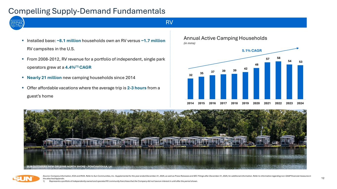 Compelling Supply-Demand Fundamentals 11 MH – North America Source: Company information, U.S. Bureau of Labor Statistics., Wall Street Research and Zillow. Refer to Sun Communities, Inc. Supplemental for the year ended December 31, 2025, as well as Press Releases and SEC Filings after December 31, 2025, for additional information. Refer to information regarding non-GAAP financial measures in the attached Appendix. 1) Source: Wolfe Research, CoStar, and NIC Map. 2) MH sites in North America only (January 2023 – December 2025). 3) MH Same Property. Virtually no new supply 25% more space than multi-family and single-family rentals at ~50% less cost per square foot Annual physical home move-outs average 0.4%(2) 98.1% occupied at December 31, 2025(3) 97.5% average occupancy for the five years ended 12/31/25(3) Demand Supply(1) In GFC, Residents Moved into SUI Communities in Record Numbers US unemployment rate and SUI same property occupancy through GFC INDEPENDENCE COMMONS – POTTERVILLE, MI 5.8% 9.3% 9.6% 8.9% 8.1% 76% 80% 84% 88% 0% 4% 8% 12% 2008 2009 2010 2011 2012 SU I S am e Pr op er ty O cc up an cy U S U ne m pl oy m en t R at e US Unemployment Rate SUI Same Property Occupancy 0.0% 1.0% 2.0% 3.0% 4.0% 5.0% 6.0% 2015 2016 2017 2018 2019 2020 2021 2022 2023 2024 2025 Manufactured Housing Senior Housing Storage Multifamily U.S. Inventory Growth by Property Type