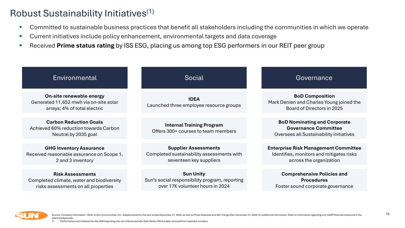 Unencumbered 80% Encumbered 20% Fortress, Investment Grade Balance Sheet 14 100% fixed rate Credit Statistics Rate Type(1) Upcoming Mortgage Maturities ($ in millions)(1)(2) 11.6% 0.0% 4.1% % of Total Encumbrance(1) Gross Asset Value 68.5% NOI Unencumbered(3) Total Debt Outstanding ($ in millions)(2) $492 $0 $176 $311 2026 2027 2028 2029 As of December 31, 2025 Mortgage Loans Payable & Secured Borrowings $2,472 Unsecured Notes 1,787 Total Debt Outstanding $4,259 Net Debt / TTM EBITDA 3.4x Cash Balance $636 BBB+ Baa2 7.3% Source: Company information. Refer to Sun Communities, Inc. Supplemental for the year ended December 31, 2025, as well as Press Releases and SEC Filings after December 31, 2025, for additional information. Refer to information regarding non-GAAP financial measures in the attached Appendix. Note: With respect to guidance, estimates and forecasted information, see “Cautionary Statement Regarding Guidance” on page 2 of this presentation. 1) As of December 31, 2025. 2) For further debt breakdown, please refer to the Supplemental for the quarter ended December 31, 2025. 3) Calculated using trailing 12-months NOI for the quarter ended December 31, 2025.