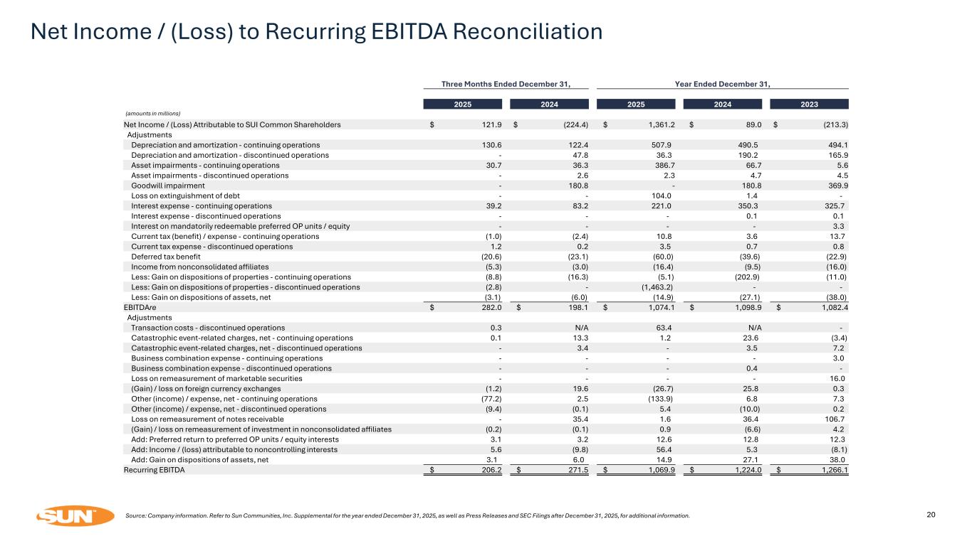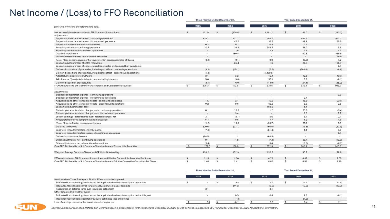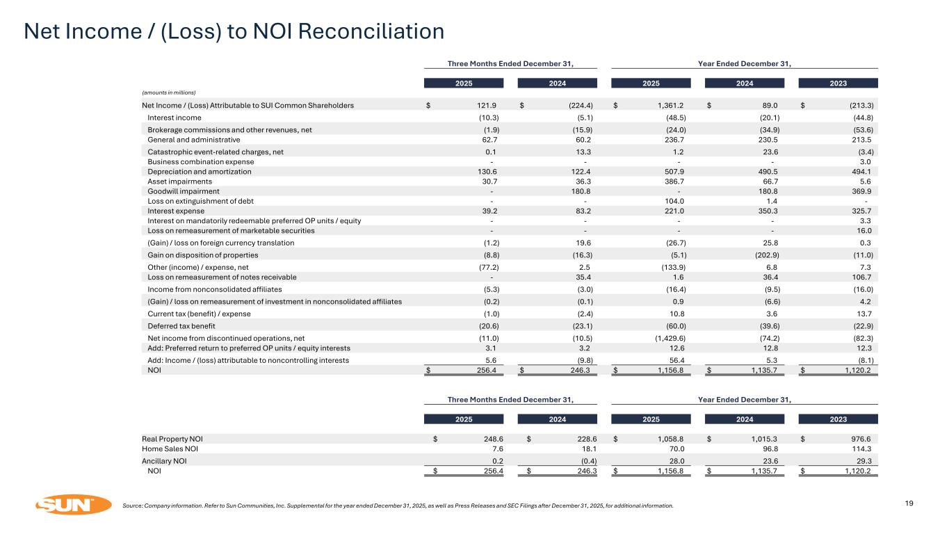 18Source: Company information. Refer to Sun Communities, Inc. Supplemental for the year ended December 31, 2025, as well as Press Releases and SEC Filings after December 31, 2025, for additional information. Net Income / (Loss) to FFO Reconciliation Three Months Ended December 31, Year Ended December 31, 2025 2024 2025 2024 2023 Net Income / (Loss) Attributable to SUI Common Shareholders $ 121.9 $ (224.4) $ 1,361.2 $ 89.0 $ (213.3) Adjustments Depreciation and amortization - continuing operations 128.1 121.7 501.0 487.6 491.7 Depreciation and amortization - discontinued operations - 47.7 36.2 189.9 165.5 Depreciation on nonconsolidated affiliates 0.2 0.2 0.8 0.5 0.2 Asset impairments - continuing operations 30.7 36.3 386.7 66.7 5.6 Asset impairments - discontinued operations - 2.6 2.3 4.7 4.5 Goodwill impairment - 180.8 - 180.8 369.9 Loss on remeasurement of marketable securities - - - - 16.0 (Gain) / loss on remeasurement of investment in nonconsolidated affiliates (0.2) (0.1) 0.9 (6.6) 4.2 Loss on remeasurement of notes receivable - 35.4 1.6 36.4 106.7 Loss on remeasurement of collateralized receivables and secured borrowings, net - - - - 0.4 Gain on dispositions of properties, including tax effect - continuing operations (9.2) (15.1) (5.5) (203.6) (8.9) Gain on dispositions of properties, including tax effect - discontinued operations (1.8) - (1,460.6) - - Add: Returns on preferred OP units 3.1 3.2 12.4 12.8 12.3 Add: Income / (loss) attributable to noncontrolling interests 5.6 (9.8) 56.4 5.3 (8.1) Gain on disposition of assets, net (3.1) (6.0) (14.9) (27.1) (38.0) FFO Attributable to SUI Common Shareholders and Convertible Securities $ 275.3 $ 172.5 $ 878.5 $ 836.4 $ 908.7 Adjustments Business combination expense - continuing operations - - - - 3.0 Business combination expense - discontinued operations - - - 0.4 - Acquisition and other transaction costs - continuing operations 1.5 3.1 19.8 16.0 22.8 Acquisition and other transaction costs - discontinued operations 0.2 0.6 63.8 3.6 2.5 Loss on extinguishment of debt - - 104.0 1.4 - Catastrophic event-related charges, net - continuing operations 0.1 13.3 1.2 23.6 (3.4) Catastrophic event-related charges, net - discontinued operations - 3.4 - 3.5 7.2 Loss of earnings - catastrophic event-related charges, net 3.1 (8.1) 5.6 3.4 2.1 Accelerated deferred compensation amortization 5.7 0.5 7.7 1.2 1.6 (Gain) / loss on foreign currency exchanges (1.2) 19.6 (26.7) 25.8 0.3 Deferred tax benefit (20.6) (23.1) (60.0) (39.6) (22.9) Long term lease termination (gains) / losses (7.3) - (51.4) 1.1 4.0 Long term lease termination losses - discontinued operations - - - - 0.4 Gain on insurance settlement (68.5) - (68.5) - - Other adjustments, net - continuing operations 0.1 4.8 (7.1) 20.1 (10.3) Other adjustments, net - discontinued operations (9.4) - 5.4 (10.0) (0.2) Core FFO Attributable to SUI Common Shareholders and Convertible Securities $ 179.0 $ 186.6 $ 872.3 $ 886.9 $ 915.8 Weighted Average Common Shares and OP Units Outstanding 128.2 132.3 130.7 130.2 128.9 FFO Attributable to SUI Common Shareholders and Dilutive Convertible Securities Per Share $ 2.15 $ 1.30 $ 6.72 $ 6.42 $ 7.05 Core FFO Attributable to SUI Common Shareholders and Dilutive Convertible Securities Per Share $ 1.40 $ 1.41 $ 6.68 $ 6.81 $ 7.10 Three Months Ended December 31, Year Ended December 31, 2025 2024 2025 2024 2023 Hurricane Ian - Three Fort Myers, Florida RV communities impaired Estimated loss of earnings in excess of the applicable business interruption deductible $ - $ 4.0 $ 12.0 $ 19.2 $ 21.9 Insurance recoveries received for previously estimated loss of earnings - (11.3) (9.9) (16.3) (19.7) Recognition of deferred lump sum insurance settlement 3.1 - 3.1 - - Other catastrophic weather event Estimated loss of earnings in excess of the applicable business interruption deductible, net - 0.5 0.4 1.8 (0.1) Insurance recoveries realized for previously estimated loss of earnings - (1.3) - (1.3) - Loss of earnings - catastrophic event-related charges, net $ 3.1 $ (8.1) $ 5.6 $ 3.4 $ 2.1 (amounts in millions except per share data)