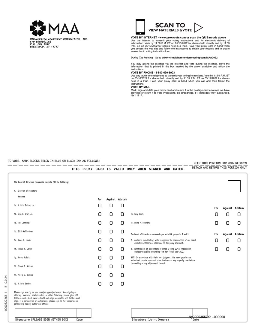 I am pleased to invite you to attend the 2022 Annual Meeting of Shareholders of Mid-America Apartment Communities, Inc. The meeting will be held at 12:30 p.m., Central Daylight Time, on Tuesday, May 17, 2022. We will be conducting the meeting online in order to provide all of our shareholders the opportunity to participate as they would at an in-person meeting, including the right to vote and ability to ask questions through the virtual meeting platform. We believe a virtual-only format allows equal access to our shareholders as it eliminates both the cost associated with physically attending the meeting for our geographically dispersed shareholders and any health concerns or limitations of our shareholders, associates and Directors.