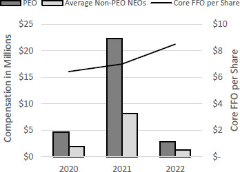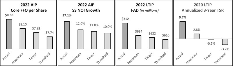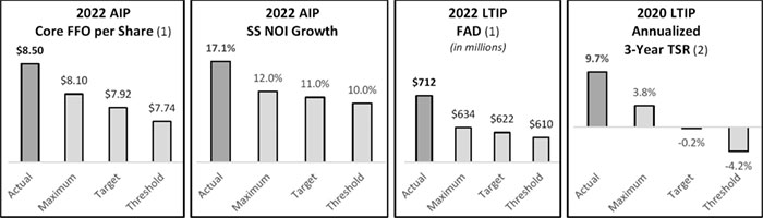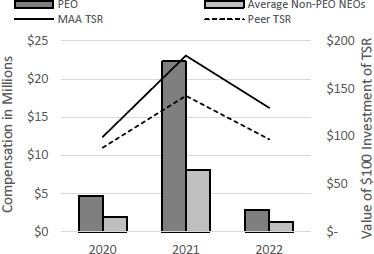| ✓ | The 2022 executive compensation packages added a cap to awards offered under the three-year relative total shareholder return metric in the long-term incentive plan when MAA’s total shareholder return for the performance period is negative. Regardless of by how much MAA outperforms the industry index, the Compensation Committee believes if MAA’s total shareholder return is negative, awards should be capped at the target level. The committee feels this acknowledges the swing in market cycles, encourages performance in down markets and rewards executives for their outperformance within the multifamily sector while also acknowledging the negative returns experienced by shareholders. See pages 51-53 for more information on the long-term incentive plan. |