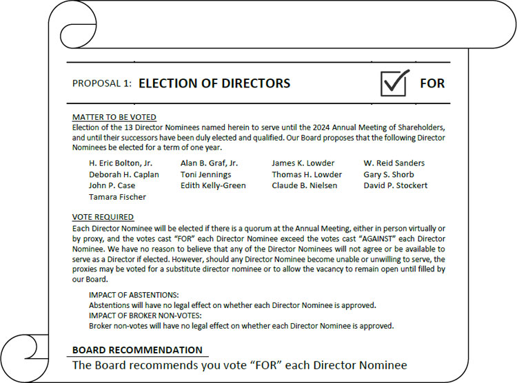 | 1 | Elect the 13 Director Nominees named in the Proxy Statement to serve until the 2024 Annual Meeting of Shareholders, and until their successors have been duly elected and qualified. |
