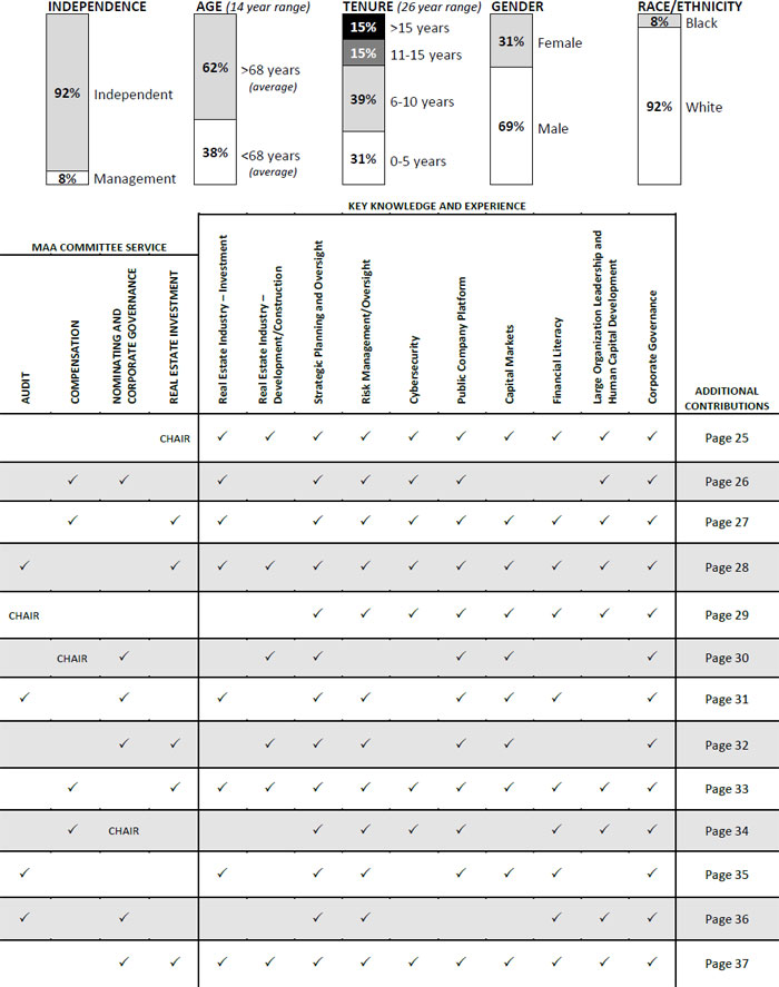| ✓ Under our mandatory age limitation policy to encourage director refreshment, Philip W. Norwood is not eligible to be nominated for election by shareholders at the 2023 Annual Meeting of Shareholders. As such, you will not find him in our list of director nominees. Mr. Norwood has provided 15 years of sound guidance to the Board of Directors and MAA and we thank him for his service. | ✓ Deborah H. Caplan was appointed to the Board on March 21, 2023 and is listed as a director nominee for shareholder approval at the 2023 Annual Meeting of Shareholders. You can find information on the skills, abilities and expertise she will contribute to our Board of Directors on pages 26, 38-39. We encourage you to vote FOR Ms. Caplan’s appointment. | ✓ John P. Case and Tamara Fischer are new Director Nominees being presented for shareholder approval. You can find information on the skills, abilities and expertise they will contribute to our Board of Directors on pages 27, 38-39, for Mr. Case and 28, 38-39, for Ms. Fischer. We encourage you to vote FOR Mr. Case’s and Ms. Fischer’s appointments. |