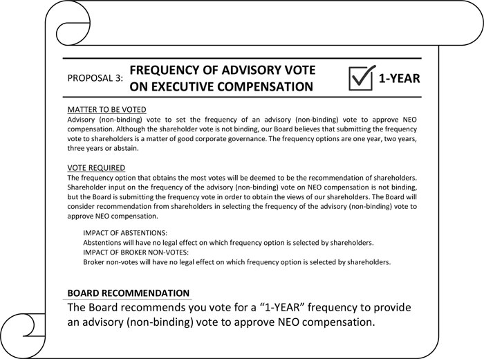 | 3 | Advisory (non-binding) vote on the frequency of the advisory (non-binding) vote to approve NEO compensation. | ✓ 1 YEAR | 76 | |