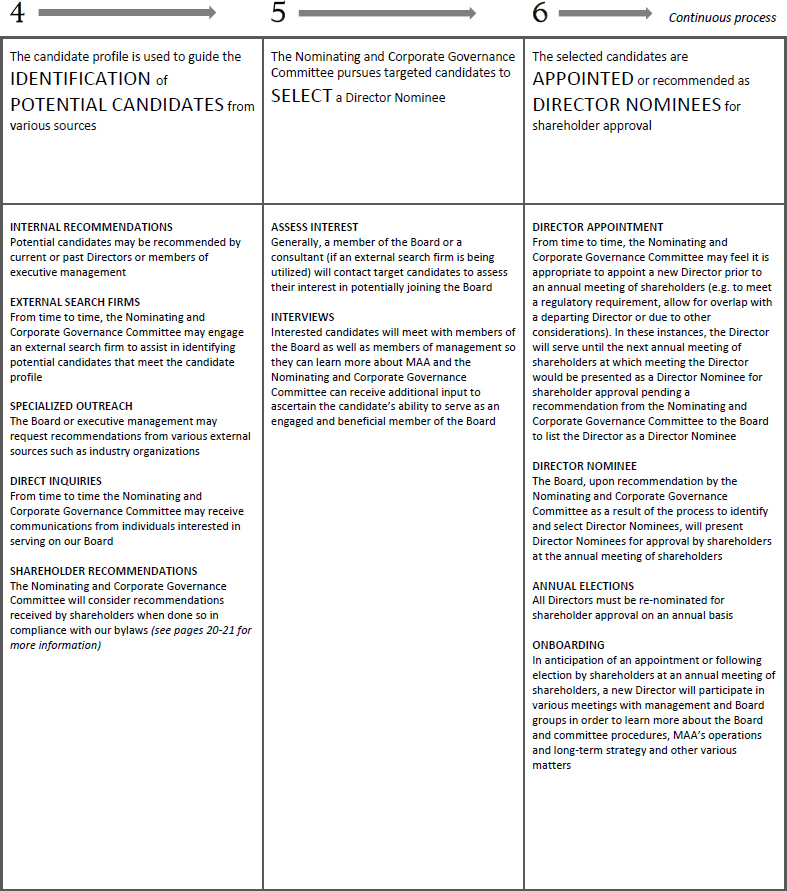 Our bylaws require eligible shareholders to give advance notice of any proxy access Director nomination. The required notice, which must include the information and documents set forth in our bylaws, must be given no less than 120 days prior to the anniversary of the date of the proxy statement for the prior year’s annual meeting of shareholders. Accordingly, to be timely for the 2025 Annual Meeting of Shareholders, our Corporate Secretary must receive the required notice no later than December 9, 2024. Notice must be sent to Attention: Corporate Secretary, MAA, 6815 Poplar Avenue, Suite 500, Germantown, Tennessee 38138.
