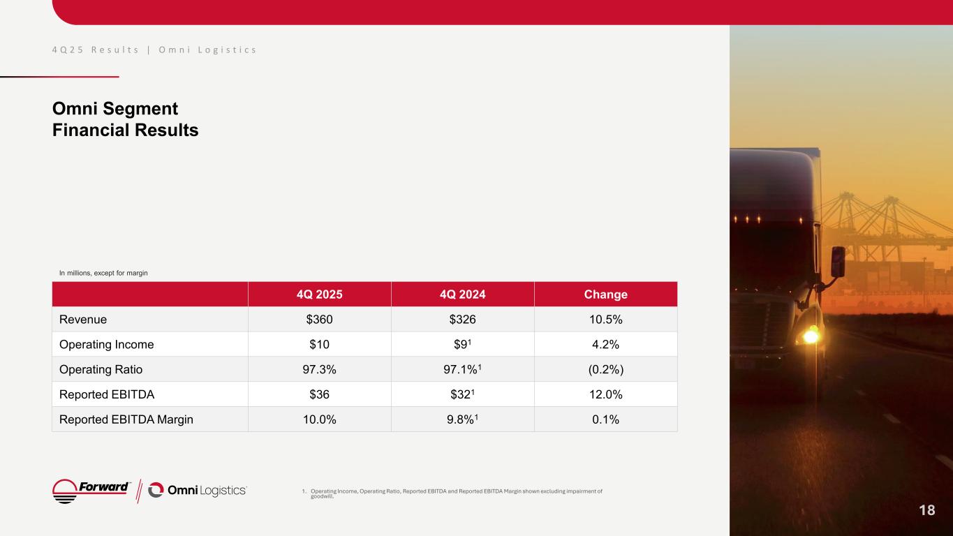 4 Q 2 5 R e s u l t s | O m n i L o g i s t i c s Omni Logistics Segment Results by Quarter Reported EBITDA2 & Reported EBITDA Margin %2Segment Revenue1 17 1. Segment totals do not include intercompany eliminations or corporate unallocated expenses 2. Reconciliation of Non-GAAP financial measures available in the Appendix. Excludes impairment of goodwill. $326 $323 $328 $340 $360 4Q24 1Q25 2Q25 3Q25 4Q25 In millions, except for margin $32 $26 $30 $33 $36 9.8% 7.9% 9.0% 9.6% 10.0% 4Q24 1Q25 2Q25 3Q25 4Q25