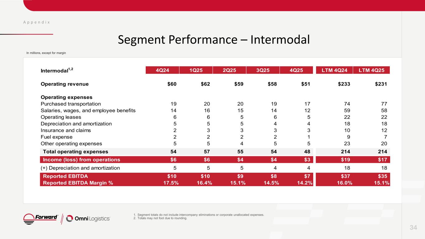 A p p e n d i x Segment Performance – Omni Logistics 33 1. Segment totals do not include intercompany eliminations or corporate unallocated expenses. 2. Totals may not foot due to rounding. 3. Reported EBITDA and Reported EBITDA Margin shown excluding impairment of goodwill. In millions, except for margin Omni Logistics1,2 4Q24 1Q25 2Q25 3Q25 4Q25 LTM 4Q24 LTM 4Q25 Operating revenue $326 $323 $328 $340 $360 $1,197 $1,351 Operating expenses Purchased transportation 183 186 185 196 208 701 775 Salaries, wages, and employee benefits 54 57 62 58 55 216 232 Operating leases 23 27 26 30 32 97 115 Depreciation and amortization 23 22 22 23 26 84 94 Insurance and claims 4 3 1 (0) 1 12 5 Fuel expense 1 1 1 1 1 3 4 Other operating expenses 29 25 24 22 27 101 97 Impairment of goodwill (79) - - - - 1,029 - Total operating expenses 237 320 321 330 350 2,242 1,321 Income (loss) from operations $89 $3 $7 $10 $10 ($1,045) $30 (+) Impairment of goodwill (79) - - - - 1,029 - Adjusted income (loss) from operations $9 $3 $7 $10 $10 ($16) $30 (+) Depreciation and amortization 23 22 22 23 26 84 94 Reported EBITDA3 $32 $26 $30 $33 $36 $67 $124 Reported EBITDA Margin %3 9.8% 7.9% 9.0% 9.6% 10.0% 5.6% 9.2%