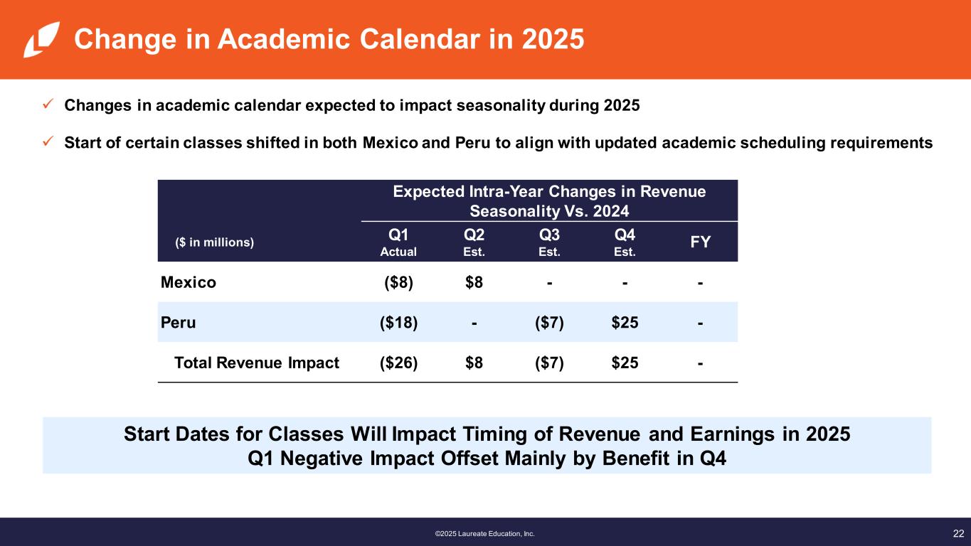 21©2025 Laureate Education, Inc. Q2 2025 Guidance ($ in millions) Q2 2025 Outlook1 Revenue $499 – $504 Adjusted EBITDA $191 – $194 (1) Outlook is based on actual FX rates for April Spot FX rates (local currency per US dollar) of MXN 20.50 & PEN 3.71 for May and June 2025. FX impact may change based on fluctuations in currency rates in future periods. Amounts presented in whole numbers may be rounded. Note: An outlook for Q2 2025 net income and reconciliation of the forward-looking Q2 2025 Adjusted EBITDA outlook to projected net income is not being provided as the company does not currently have sufficient data to accurately estimate the variables and individual adjustments for such outlook and reconciliation. Due to this uncertainty, the company cannot reconcile Adjusted EBITDA to projected net income without unreasonable effort. Continued Growth Expected During Q2