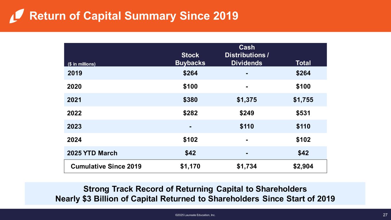 27©2025 Laureate Education, Inc. Return of Capital Summary Since 2019 ($ in millions) Stock Buybacks Cash Distributions / Dividends Total 2019 $264 - $264 2020 $100 - $100 2021 $380 $1,375 $1,755 2022 $282 $249 $531 2023 - $110 $110 2024 $102 - $102 2025 YTD March $42 - $42 Cumulative Since 2019 $1,170 $1,734 $2,904 Strong Track Record of Returning Capital to Shareholders Nearly $3 Billion of Capital Returned to Shareholders Since Start of 2019