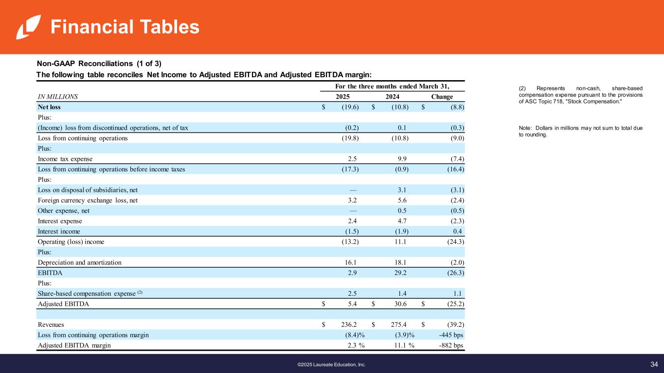 34©2025 Laureate Education, Inc. Financial Tables Non-GAAP Reconciliations (1 of 3) The following table reconciles Net Income to Adjusted EBITDA and Adjusted EBITDA margin: (2) Represents non-cash, share-based compensation expense pursuant to the provisions of ASC Topic 718, "Stock Compensation." Note: Dollars in millions may not sum to total due to rounding. For the three months ended March 31, IN MILLIONS 2025 2024 Change Net loss $ (19.6) $ (10.8) $ (8.8) Plus: (Income) loss from discontinued operations, net of tax (0.2) 0.1 (0.3) Loss from continuing operations (19.8) (10.8) (9.0) Plus: Income tax expense 2.5 9.9 (7.4) Loss from continuing operations before income taxes (17.3) (0.9) (16.4) Plus: Loss on disposal of subsidiaries, net — 3.1 (3.1) Foreign currency exchange loss, net 3.2 5.6 (2.4) Other expense, net — 0.5 (0.5) Interest expense 2.4 4.7 (2.3) Interest income (1.5) (1.9) 0.4 Operating (loss) income (13.2) 11.1 (24.3) Plus: Depreciation and amortization 16.1 18.1 (2.0) EBITDA 2.9 29.2 (26.3) Plus: Share-based compensation expense (2) 2.5 1.4 1.1 Adjusted EBITDA $ 5.4 $ 30.6 $ (25.2) Revenues $ 236.2 $ 275.4 $ (39.2) Loss from continuing operations margin (8.4)% (3.9)% -445 bps Adjusted EBITDA margin 2.3 % 11.1 % -882 bps