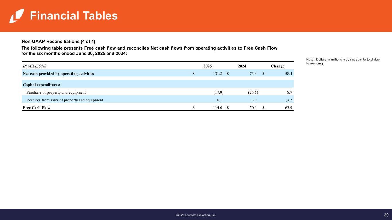 39©2025 Laureate Education, Inc. Financial Tables Non-GAAP Reconciliations (4 of 4) The following table presents Free cash flow and reconciles Net cash flows from operating activities to Free Cash Flow for the six months ended June 30, 2025 and 2024: Note: Dollars in millions may not sum to total due to rounding. IN MILLIONS 2025 2024 Change Net cash provided by operating activities $ 131.8 $ 73.4 $ 58.4 Capital expenditures: Purchase of property and equipment (17.9) (26.6) 8.7 Receipts from sales of property and equipment 0.1 3.3 (3.2) Free Cash Flow $ 114.0 $ 50.1 $ 63.9