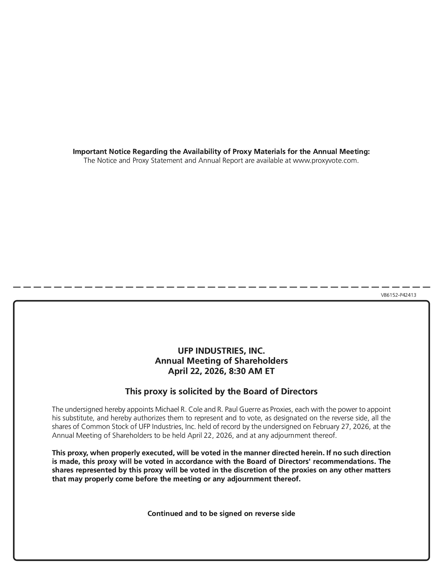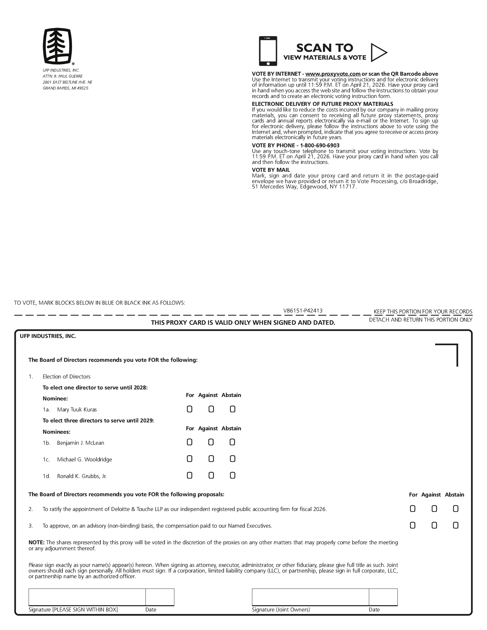 ![]() Matthew J. Missad Executive Chairman of the Board of UFP Industries, Inc. Age: 65 Director since: 2011 | MATTHEW J. MISSAD, became Chairman of our Board of Directors on February 2, 2023, and Executive Chairman of our Board on December 29, 2024. He became the fifth Chief Executive Officer in the Company’s history on July 13, 2011, and President of the Company on January 1, 2023, positions he held until his appointment as Executive Chairman. From 1996 to 2011, he was Executive Vice President, General Counsel and Secretary, in addition to serving on the boards of subsidiary entities, including international partnerships. Mr. Missad served on the board of Independent Bank Corporation (Nasdaq: IBCP) from October 2014 to April 2024, and served on its Compensation Committee. Mr. Missad has a JD degree, is a member of the Michigan Bar Association, has a CPA certificate of examination, and is a licensed real estate broker. Mr. Missad’s experience and exposure to nearly all facets of our business are integral to the growth of the Company. Having led, at various times, the human resources, insurance, marketing, wood preservation, engineering, transportation and compliance teams, and serving on our executive leadership team, he has an ability to understand and motivate people and teams, a capacity to simplify complex issues for sound decision-making, and a well-rounded and deep understanding of the Company’s business, culture, people, markets and opportunities. Director since 2011 | ||