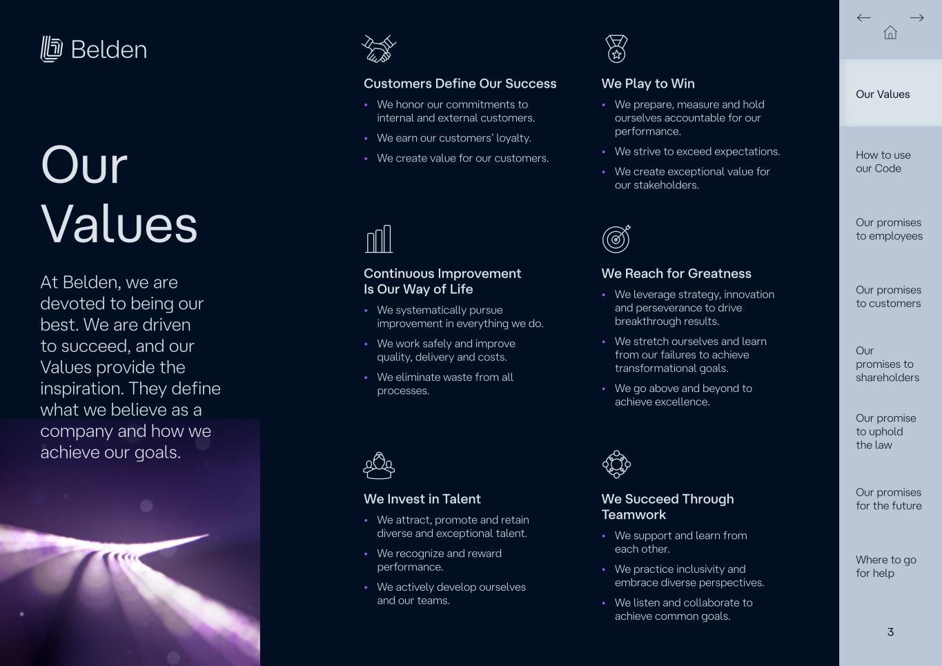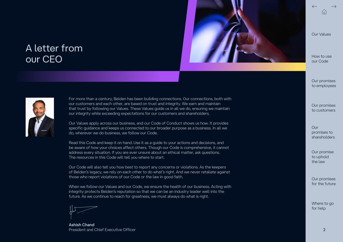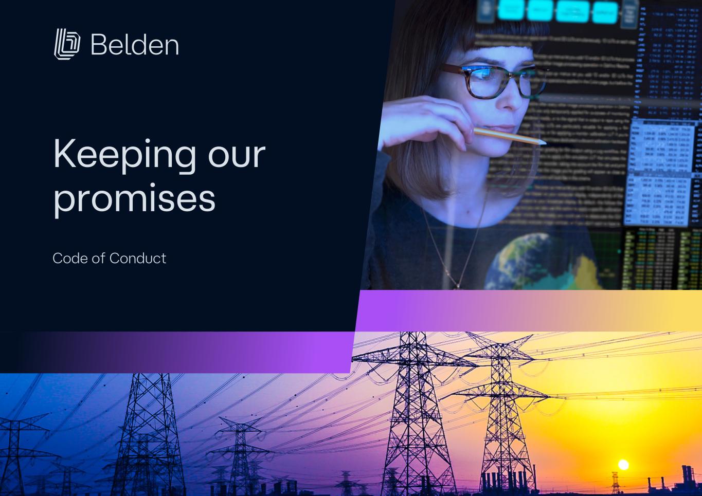 For more than a century, Belden has been building connections. Our connections, both with our customers and each other, are based on trust and integrity. We earn and maintain that trust by following our Values. These Values guide us in all we do, ensuring we maintain our integrity while exceeding expectations for our customers and shareholders. Our Values apply across our business, and our Code of Conduct shows us how. It provides specific guidance and keeps us connected to our broader purpose as a business. In all we do, wherever we do business, we follow our Code. Read this Code and keep it on hand. Use it as a guide to your actions and decisions, and be aware of how your choices affect others. Though our Code is comprehensive, it cannot address every situation. If you are ever unsure about an ethical matter, ask questions. The resources in this Code will tell you where to start. Our Code will also tell you how best to report any concerns or violations. As the keepers of Belden’s legacy, we rely on each other to do what’s right. And we never retaliate against those who report violations of our Code or the law in good faith. When we follow our Values and our Code, we ensure the health of our business. Acting with integrity protects Belden’s reputation so that we can be an industry leader well into the future. As we continue to reach for greatness, we must always do what is right. Ashish Chand President and Chief Executive Officer A letter from our CEO Our Values How to use our Code Our promises to employees Our promises to customers Our promises to shareholders Our promise to uphold the law Our promises for the future Where to go for help 2