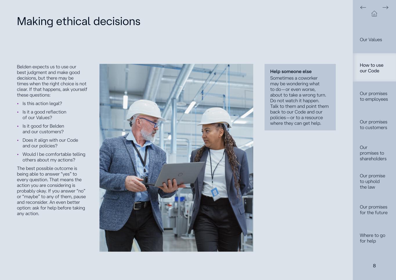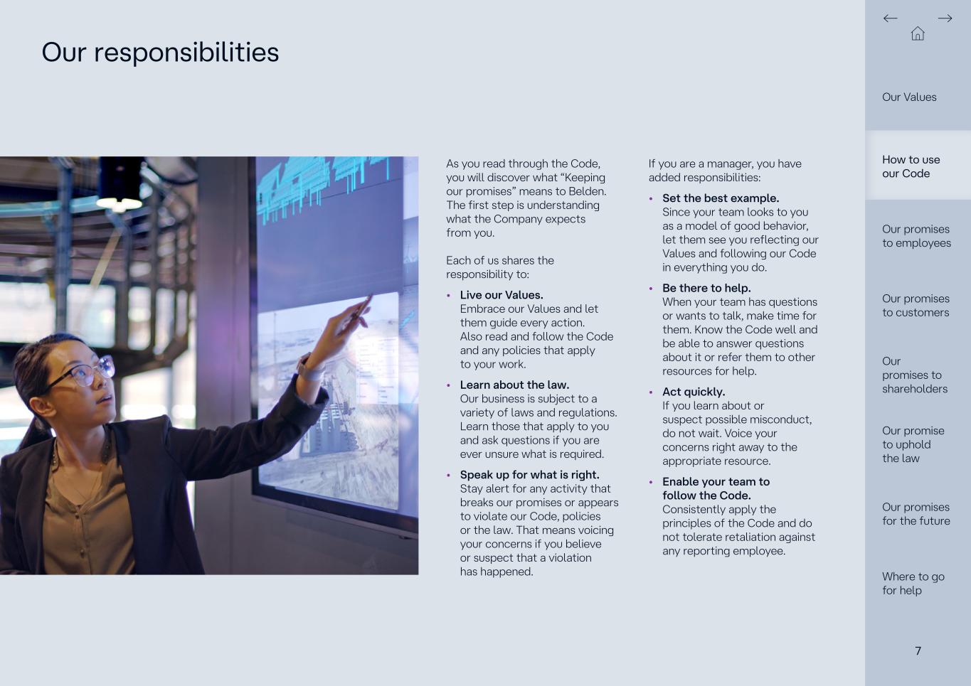 Our responsibilities As you read through the Code, you will discover what “Keeping our promises” means to Belden. The first step is understanding what the Company expects from you. Each of us shares the responsibility to: • Live our Values. Embrace our Values and let them guide every action. Also read and follow the Code and any policies that apply to your work. • Learn about the law. Our business is subject to a variety of laws and regulations. Learn those that apply to you and ask questions if you are ever unsure what is required. • Speak up for what is right. Stay alert for any activity that breaks our promises or appears to violate our Code, policies or the law. That means voicing your concerns if you believe or suspect that a violation has happened. If you are a manager, you have added responsibilities: • Set the best example. Since your team looks to you as a model of good behavior, let them see you reflecting our Values and following our Code in everything you do. • Be there to help. When your team has questions or wants to talk, make time for them. Know the Code well and be able to answer questions about it or refer them to other resources for help. • Act quickly. If you learn about or suspect possible misconduct, do not wait. Voice your concerns right away to the appropriate resource. • Enable your team to follow the Code. Consistently apply the principles of the Code and do not tolerate retaliation against any reporting employee. Our Values Our promises to employees Our promises to customers Our promises to shareholders Our promise to uphold the law Our promises for the future Where to go for help 7 How to use our Code