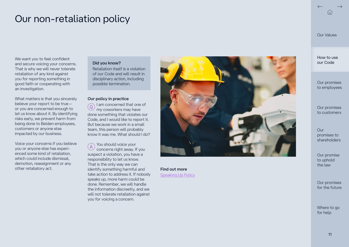 Our non-retaliation policy We want you to feel confident and secure voicing your concerns. That is why we will never tolerate retaliation of any kind against you for reporting something in good faith or cooperating with an investigation. What matters is that you sincerely believe your report to be true — or you are concerned enough to let us know about it. By identifying risks early, we prevent harm from being done to Belden employees, customers or anyone else impacted by our business. Voice your concerns if you believe you or anyone else has experi- enced some kind of retaliation, which could include dismissal, demotion, reassignment or any other retaliatory act. Did you know? Retaliation itself is a violation of our Code and will result in disciplinary action, including possible termination. Our policy in practice Q I am concerned that one of my coworkers may have done something that violates our Code, and I would like to report it. But because we work in a small team, this person will probably know it was me. What should I do? A You should voice your concerns right away. If you suspect a violation, you have a responsibility to let us know. That is the only way we can identify something harmful and take action to address it. If nobody speaks up, more harm could be done. Remember, we will handle the information discreetly, and we will not tolerate retaliation against you for voicing a concern. Find out more Speaking Up Policy Our Values Our promises to employees Our promises to customers Our promises to shareholders Our promise to uphold the law Our promises for the future Where to go for help 11 How to use our Code