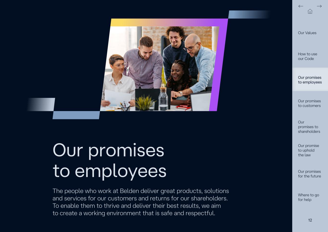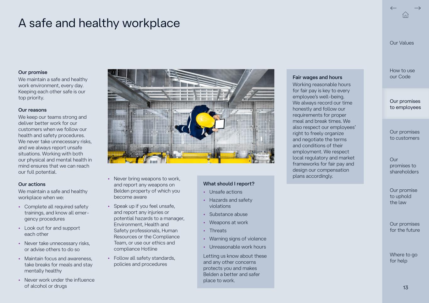 Our promises to employees The people who work at Belden deliver great products, solutions and services for our customers and returns for our shareholders. To enable them to thrive and deliver their best results, we aim to create a working environment that is safe and respectful. Our Values How to use our Code Our promises to customers Our promises to shareholders Our promise to uphold the law Our promises for the future Where to go for help 12 Our promises to employees