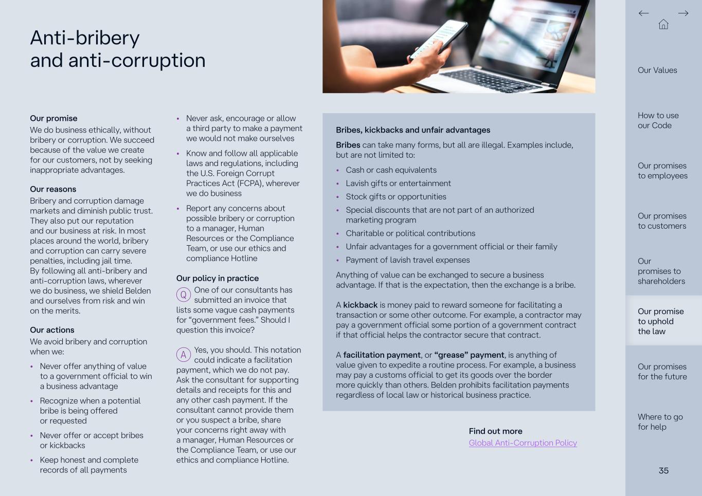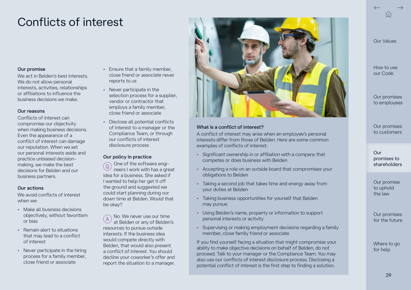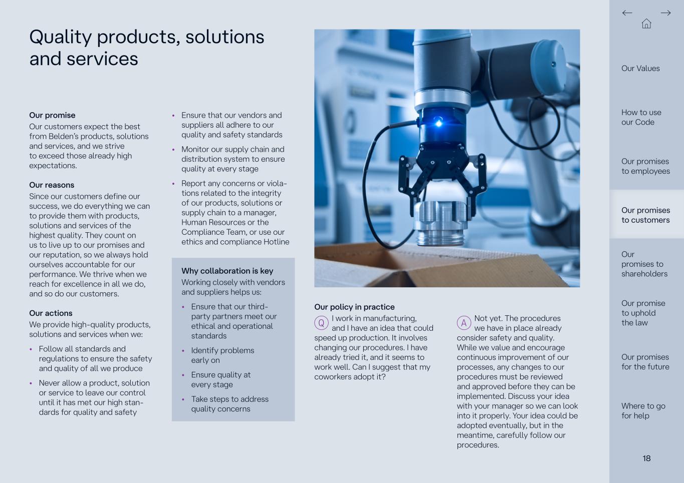 Quality products, solutions and services Our promise Our customers expect the best from Belden’s products, solutions and services, and we strive to exceed those already high expectations. Our reasons Since our customers define our success, we do everything we can to provide them with products, solutions and services of the highest quality. They count on us to live up to our promises and our reputation, so we always hold ourselves accountable for our performance. We thrive when we reach for excellence in all we do, and so do our customers. Our actions We provide high-quality products, solutions and services when we: • Follow all standards and regulations to ensure the safety and quality of all we produce • Never allow a product, solution or service to leave our control until it has met our high stan- dards for quality and safety • Ensure that our vendors and suppliers all adhere to our quality and safety standards • Monitor our supply chain and distribution system to ensure quality at every stage • Report any concerns or viola- tions related to the integrity of our products, solutions or supply chain to a manager, Human Resources or the Compliance Team, or use our ethics and compliance Hotline Why collaboration is key Working closely with vendors and suppliers helps us: • Ensure that our third- party partners meet our ethical and operational standards • Identify problems early on • Ensure quality at every stage • Take steps to address quality concerns Our policy in practice Q I work in manufacturing, and I have an idea that could speed up production. It involves changing our procedures. I have already tried it, and it seems to work well. Can I suggest that my coworkers adopt it? A Not yet. The procedures we have in place already consider safety and quality. While we value and encourage continuous improvement of our processes, any changes to our procedures must be reviewed and approved before they can be implemented. Discuss your idea with your manager so we can look into it properly. Your idea could be adopted eventually, but in the meantime, carefully follow our procedures. Our Values How to use our Code Our promises to employees Our promises to shareholders Our promise to uphold the law Our promises for the future Where to go for help 18 Our promises to customers