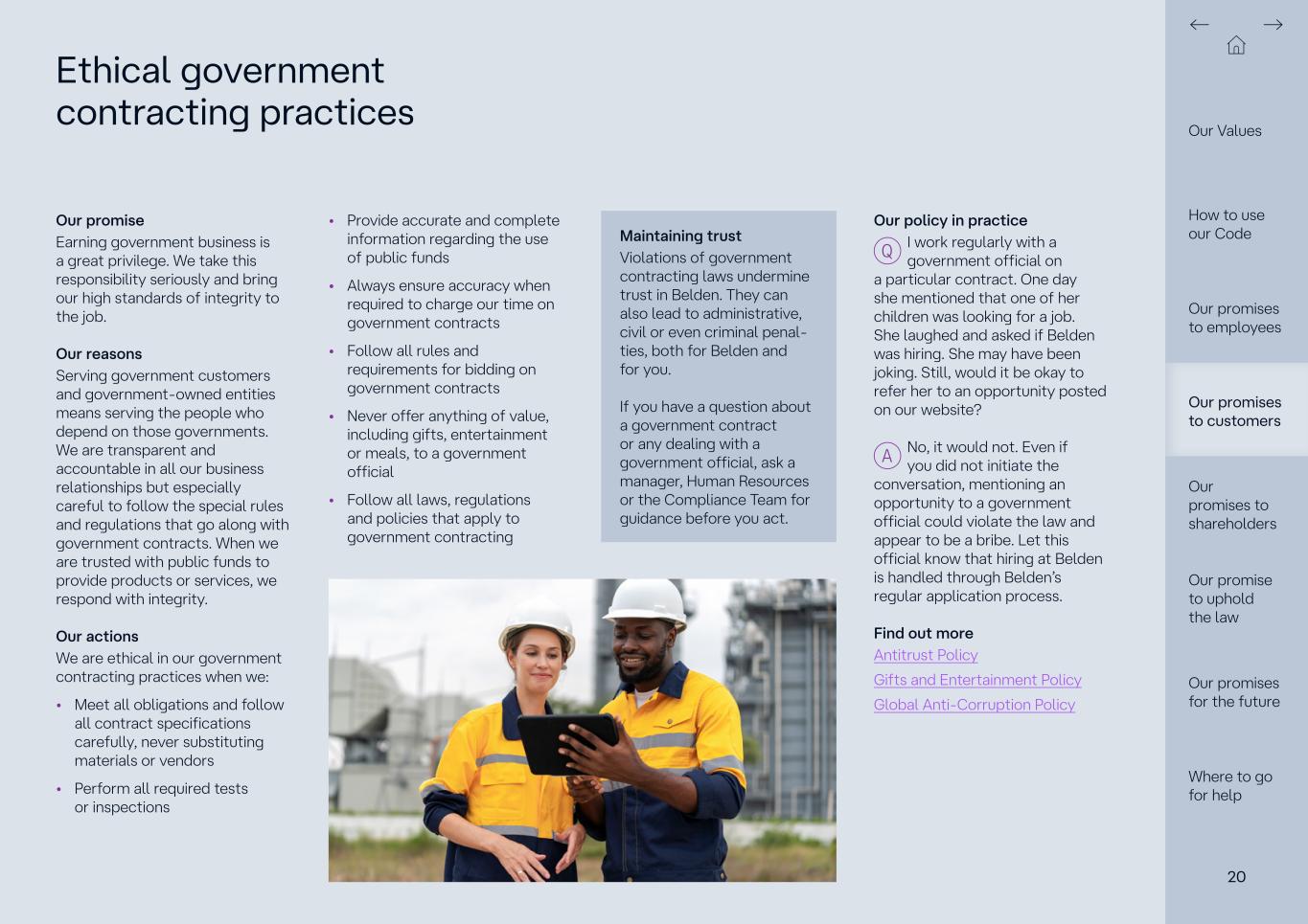Ethical government contracting practices Our promise Earning government business is a great privilege. We take this responsibility seriously and bring our high standards of integrity to the job. Our reasons Serving government customers and government-owned entities means serving the people who depend on those governments. We are transparent and accountable in all our business relationships but especially careful to follow the special rules and regulations that go along with government contracts. When we are trusted with public funds to provide products or services, we respond with integrity. Our actions We are ethical in our government contracting practices when we: • Meet all obligations and follow all contract specifications carefully, never substituting materials or vendors • Perform all required tests or inspections • Provide accurate and complete information regarding the use of public funds • Always ensure accuracy when required to charge our time on government contracts • Follow all rules and requirements for bidding on government contracts • Never offer anything of value, including gifts, entertainment or meals, to a government official • Follow all laws, regulations and policies that apply to government contracting Maintaining trust Violations of government contracting laws undermine trust in Belden. They can also lead to administrative, civil or even criminal penal- ties, both for Belden and for you. If you have a question about a government contract or any dealing with a government official, ask a manager, Human Resources or the Compliance Team for guidance before you act. Our policy in practice Q I work regularly with a government official on a particular contract. One day she mentioned that one of her children was looking for a job. She laughed and asked if Belden was hiring. She may have been joking. Still, would it be okay to refer her to an opportunity posted on our website? A No, it would not. Even if you did not initiate the conversation, mentioning an opportunity to a government official could violate the law and appear to be a bribe. Let this official know that hiring at Belden is handled through Belden’s regular application process. Find out more Antitrust Policy Gifts and Entertainment Policy Global Anti-Corruption Policy Our Values How to use our Code Our promises to employees Our promises to shareholders Our promise to uphold the law Our promises for the future Where to go for help 20 Our promises to customers