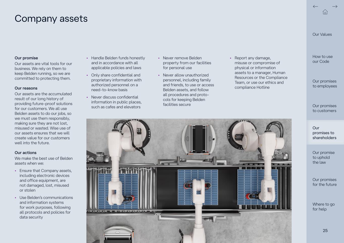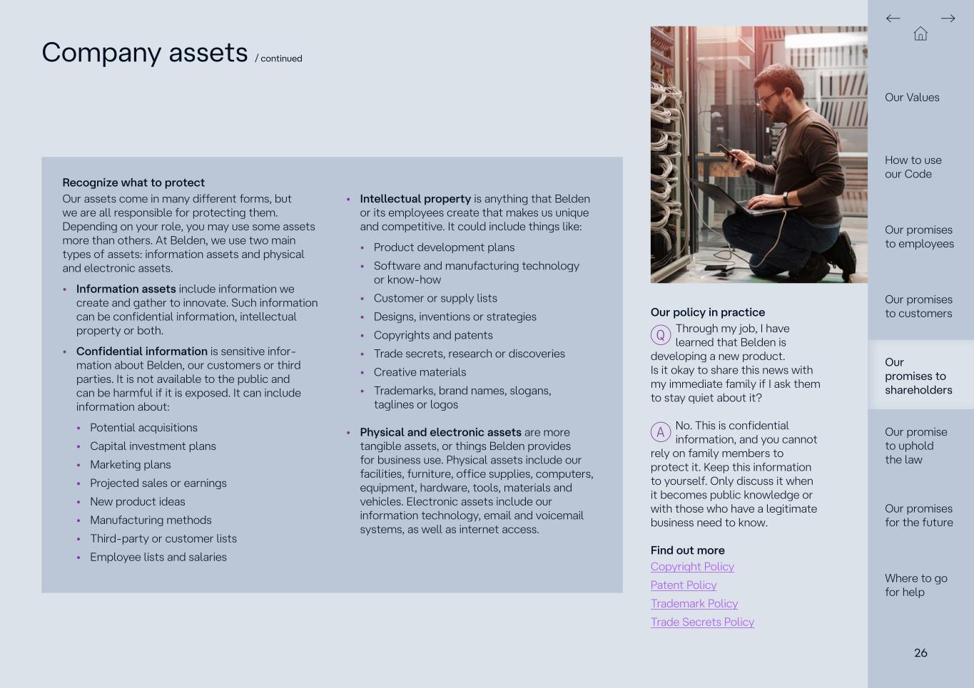Company assets Our promise Our assets are vital tools for our business. We rely on them to keep Belden running, so we are committed to protecting them. Our reasons Our assets are the accumulated result of our long history of providing future-proof solutions for our customers. We all use Belden assets to do our jobs, so we must use them responsibly, making sure they are not lost, misused or wasted. Wise use of our assets ensures that we will create value for our customers well into the future. Our actions We make the best use of Belden assets when we: • Ensure that Company assets, including electronic devices and office equipment, are not damaged, lost, misused or stolen • Use Belden’s communications and information systems for work purposes, following all protocols and policies for data security • Handle Belden funds honestly and in accordance with all applicable policies and laws • Only share confidential and proprietary information with authorized personnel on a need-to-know basis • Never discuss confidential information in public places, such as cafes and elevators • Never remove Belden property from our facilities for personal use • Never allow unauthorized personnel, including family and friends, to use or access Belden assets, and follow all procedures and proto- cols for keeping Belden facilities secure • Report any damage, misuse or compromise of physical or information assets to a manager, Human Resources or the Compliance Team, or use our ethics and compliance Hotline Our Values How to use our Code Our promises to employees Our promises to customers Our promise to uphold the law Our promises for the future Where to go for help 25 Our promises to shareholders