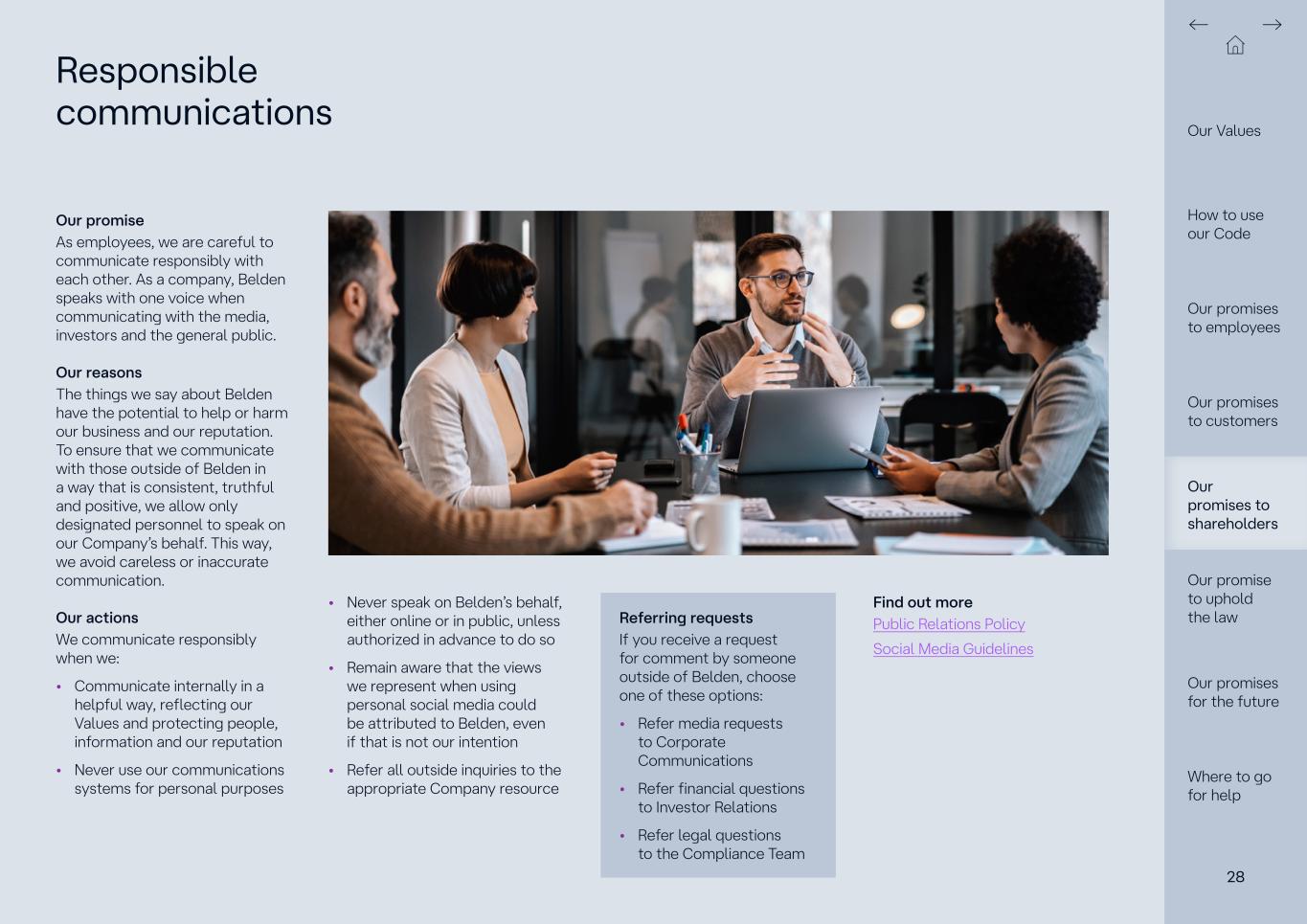Responsible communications Our promise As employees, we are careful to communicate responsibly with each other. As a company, Belden speaks with one voice when communicating with the media, investors and the general public. Our reasons The things we say about Belden have the potential to help or harm our business and our reputation. To ensure that we communicate with those outside of Belden in a way that is consistent, truthful and positive, we allow only designated personnel to speak on our Company’s behalf. This way, we avoid careless or inaccurate communication. Our actions We communicate responsibly when we: • Communicate internally in a helpful way, reflecting our Values and protecting people, information and our reputation • Never use our communications systems for personal purposes • Never speak on Belden’s behalf, either online or in public, unless authorized in advance to do so • Remain aware that the views we represent when using personal social media could be attributed to Belden, even if that is not our intention • Refer all outside inquiries to the appropriate Company resource Referring requests If you receive a request for comment by someone outside of Belden, choose one of these options: • Refer media requests to Corporate Communications • Refer financial questions to Investor Relations • Refer legal questions to the Compliance Team Find out more Public Relations Policy Social Media Guidelines Our Values How to use our Code Our promises to employees Our promises to customers Our promise to uphold the law Our promises for the future Where to go for help 28 Our promises to shareholders