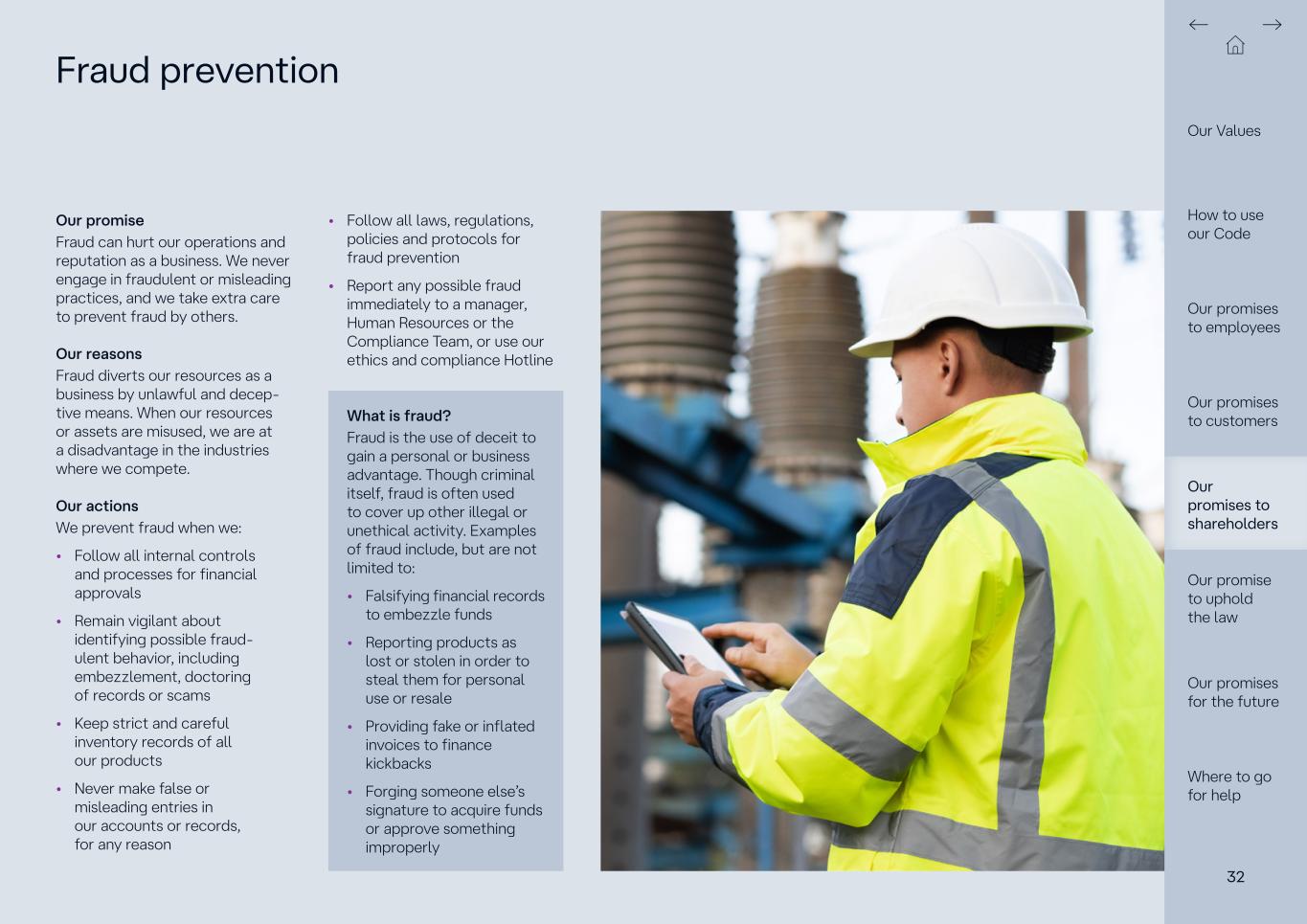 Fraud prevention Our promise Fraud can hurt our operations and reputation as a business. We never engage in fraudulent or misleading practices, and we take extra care to prevent fraud by others. Our reasons Fraud diverts our resources as a business by unlawful and decep- tive means. When our resources or assets are misused, we are at a disadvantage in the industries where we compete. Our actions We prevent fraud when we: • Follow all internal controls and processes for financial approvals • Remain vigilant about identifying possible fraud- ulent behavior, including embezzlement, doctoring of records or scams • Keep strict and careful inventory records of all our products • Never make false or misleading entries in our accounts or records, for any reason • Follow all laws, regulations, policies and protocols for fraud prevention • Report any possible fraud immediately to a manager, Human Resources or the Compliance Team, or use our ethics and compliance Hotline What is fraud? Fraud is the use of deceit to gain a personal or business advantage. Though criminal itself, fraud is often used to cover up other illegal or unethical activity. Examples of fraud include, but are not limited to: • Falsifying financial records to embezzle funds • Reporting products as lost or stolen in order to steal them for personal use or resale • Providing fake or inflated invoices to finance kickbacks • Forging someone else’s signature to acquire funds or approve something improperly Our Values How to use our Code Our promises to employees Our promises to customers Our promise to uphold the law Our promises for the future Where to go for help 32 Our promises to shareholders