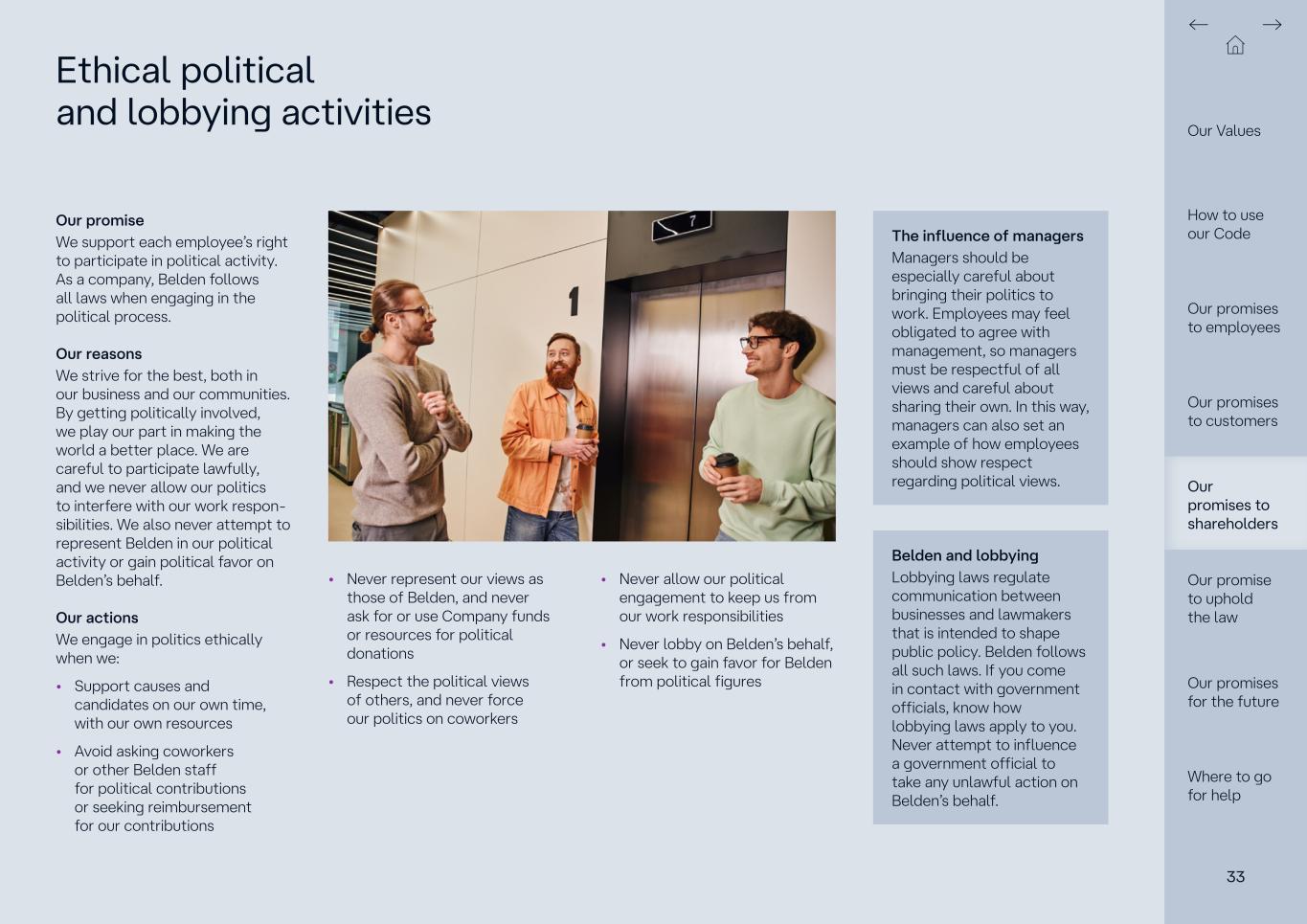 Ethical political and lobbying activities Our promise We support each employee’s right to participate in political activity. As a company, Belden follows all laws when engaging in the political process. Our reasons We strive for the best, both in our business and our communities. By getting politically involved, we play our part in making the world a better place. We are careful to participate lawfully, and we never allow our politics to interfere with our work respon- sibilities. We also never attempt to represent Belden in our political activity or gain political favor on Belden’s behalf. Our actions We engage in politics ethically when we: • Support causes and candidates on our own time, with our own resources • Avoid asking coworkers or other Belden staff for political contributions or seeking reimbursement for our contributions • Never represent our views as those of Belden, and never ask for or use Company funds or resources for political donations • Respect the political views of others, and never force our politics on coworkers • Never allow our political engagement to keep us from our work responsibilities • Never lobby on Belden’s behalf, or seek to gain favor for Belden from political figures The influence of managers Managers should be especially careful about bringing their politics to work. Employees may feel obligated to agree with management, so managers must be respectful of all views and careful about sharing their own. In this way, managers can also set an example of how employees should show respect regarding political views. Belden and lobbying Lobbying laws regulate communication between businesses and lawmakers that is intended to shape public policy. Belden follows all such laws. If you come in contact with government officials, know how lobbying laws apply to you. Never attempt to influence a government official to take any unlawful action on Belden’s behalf. Our Values How to use our Code Our promises to employees Our promises to customers Our promise to uphold the law Our promises for the future Where to go for help 33 Our promises to shareholders