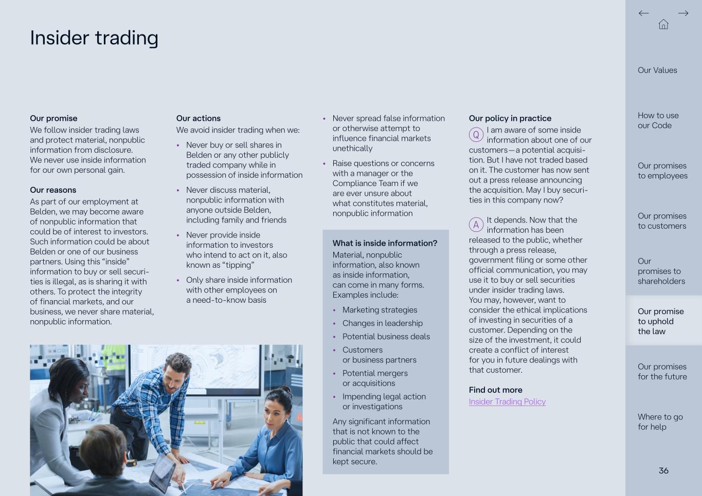 Insider trading Our promise We follow insider trading laws and protect material, nonpublic information from disclosure. We never use inside information for our own personal gain. Our reasons As part of our employment at Belden, we may become aware of nonpublic information that could be of interest to investors. Such information could be about Belden or one of our business partners. Using this “inside” information to buy or sell securi- ties is illegal, as is sharing it with others. To protect the integrity of financial markets, and our business, we never share material, nonpublic information. Our actions We avoid insider trading when we: • Never buy or sell shares in Belden or any other publicly traded company while in possession of inside information • Never discuss material, nonpublic information with anyone outside Belden, including family and friends • Never provide inside information to investors who intend to act on it, also known as “tipping” • Only share inside information with other employees on a need-to-know basis • Never spread false information or otherwise attempt to influence financial markets unethically • Raise questions or concerns with a manager or the Compliance Team if we are ever unsure about what constitutes material, nonpublic information What is inside information? Material, nonpublic information, also known as inside information, can come in many forms. Examples include: • Marketing strategies • Changes in leadership • Potential business deals • Customers or business partners • Potential mergers or acquisitions • Impending legal action or investigations Any significant information that is not known to the public that could affect financial markets should be kept secure. Our policy in practice Q I am aware of some inside information about one of our customers — a potential acquisi- tion. But I have not traded based on it. The customer has now sent out a press release announcing the acquisition. May I buy securi- ties in this company now? A It depends. Now that the information has been released to the public, whether through a press release, government filing or some other official communication, you may use it to buy or sell securities under insider trading laws. You may, however, want to consider the ethical implications of investing in securities of a customer. Depending on the size of the investment, it could create a conflict of interest for you in future dealings with that customer. Find out more Insider Trading Policy Our Values How to use our Code Our promises to employees Our promises to customers Our promises to shareholders Our promises for the future Where to go for help 36 Our promise to uphold the law