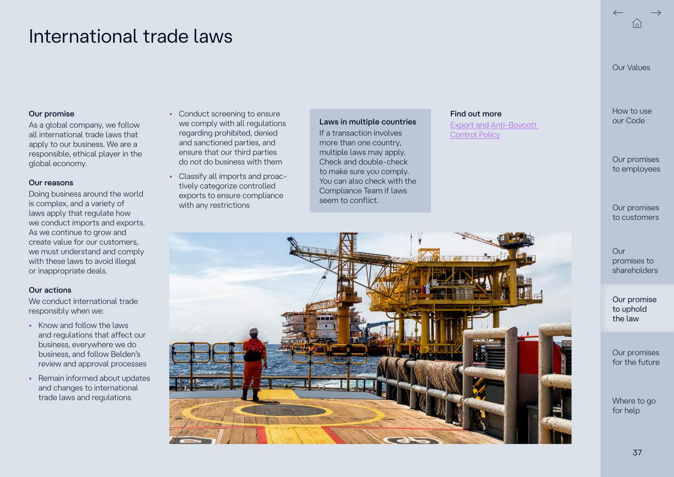 International trade laws Our promise As a global company, we follow all international trade laws that apply to our business. We are a responsible, ethical player in the global economy. Our reasons Doing business around the world is complex, and a variety of laws apply that regulate how we conduct imports and exports. As we continue to grow and create value for our customers, we must understand and comply with these laws to avoid illegal or inappropriate deals. Our actions We conduct international trade responsibly when we: • Know and follow the laws and regulations that affect our business, everywhere we do business, and follow Belden’s review and approval processes • Remain informed about updates and changes to international trade laws and regulations • Conduct screening to ensure we comply with all regulations regarding prohibited, denied and sanctioned parties, and ensure that our third parties do not do business with them • Classify all imports and proac- tively categorize controlled exports to ensure compliance with any restrictions Laws in multiple countries If a transaction involves more than one country, multiple laws may apply. Check and double-check to make sure you comply. You can also check with the Compliance Team if laws seem to conflict. Find out more Export and Anti-Boycott Control Policy Our Values How to use our Code Our promises to employees Our promises to customers Our promises to shareholders Our promises for the future Where to go for help 37 Our promise to uphold the law